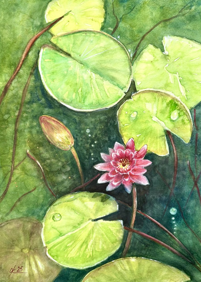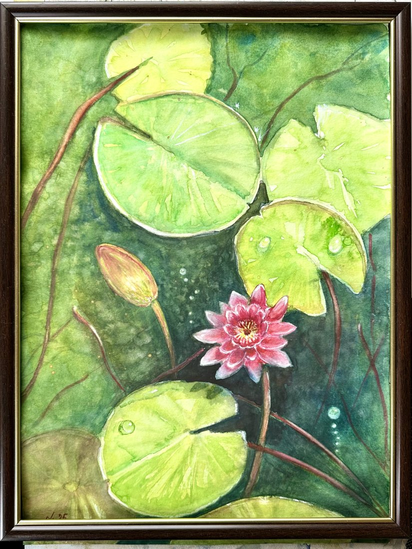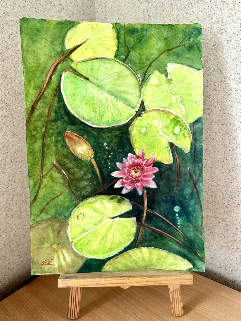 Różowe lilie wodne originalna akwareli A3 ręcznie malowana.