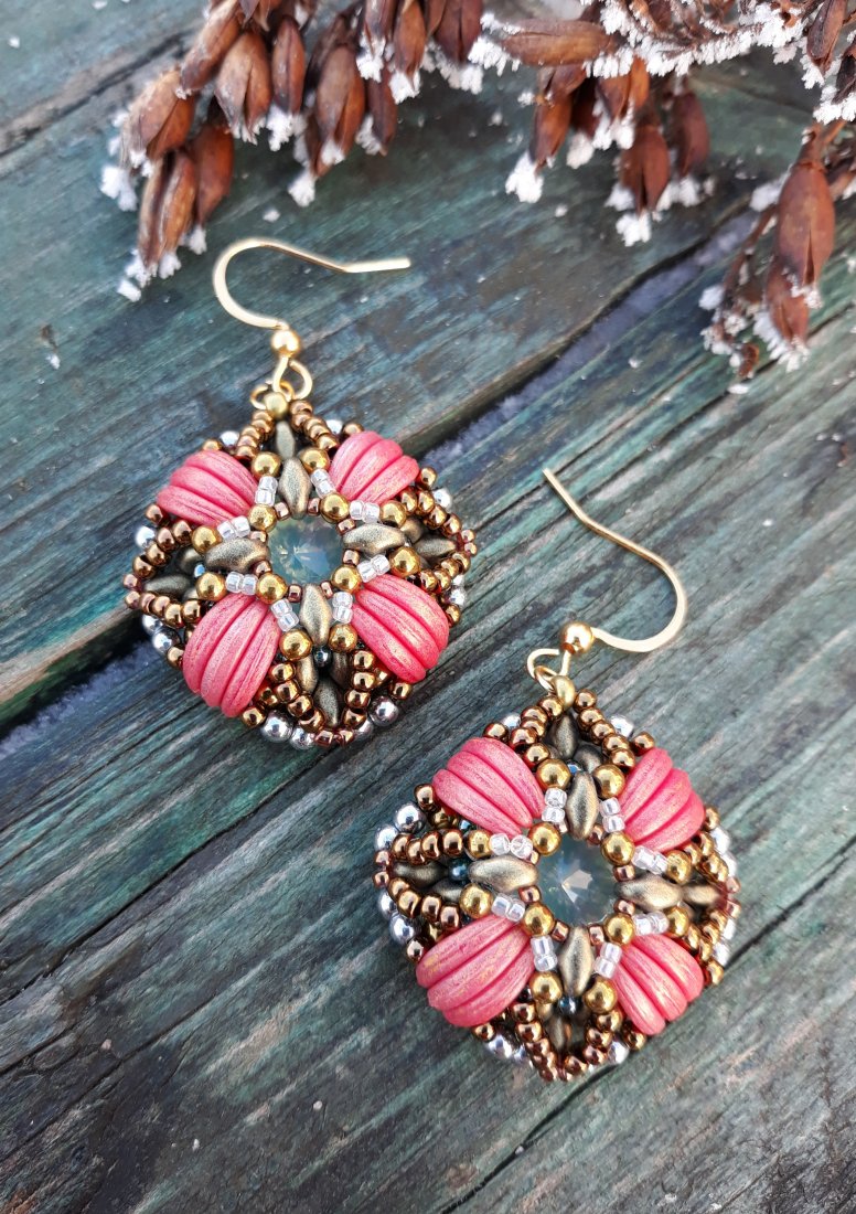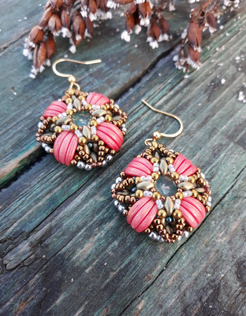 ,,różowe pazurki,, to ażurowe kolczyki wykonane z opalowej rivoli oplecionej szklanymi koralikami i kryształkami w różnych odcieniach różu, starego złota i kremu, z dodatkiem złotego i srebrnego hematytu. Kolczyki zawieszone są na ozdobnych klasycznych biglach w kolorze złota wykonanych ze stali szlachetnej.