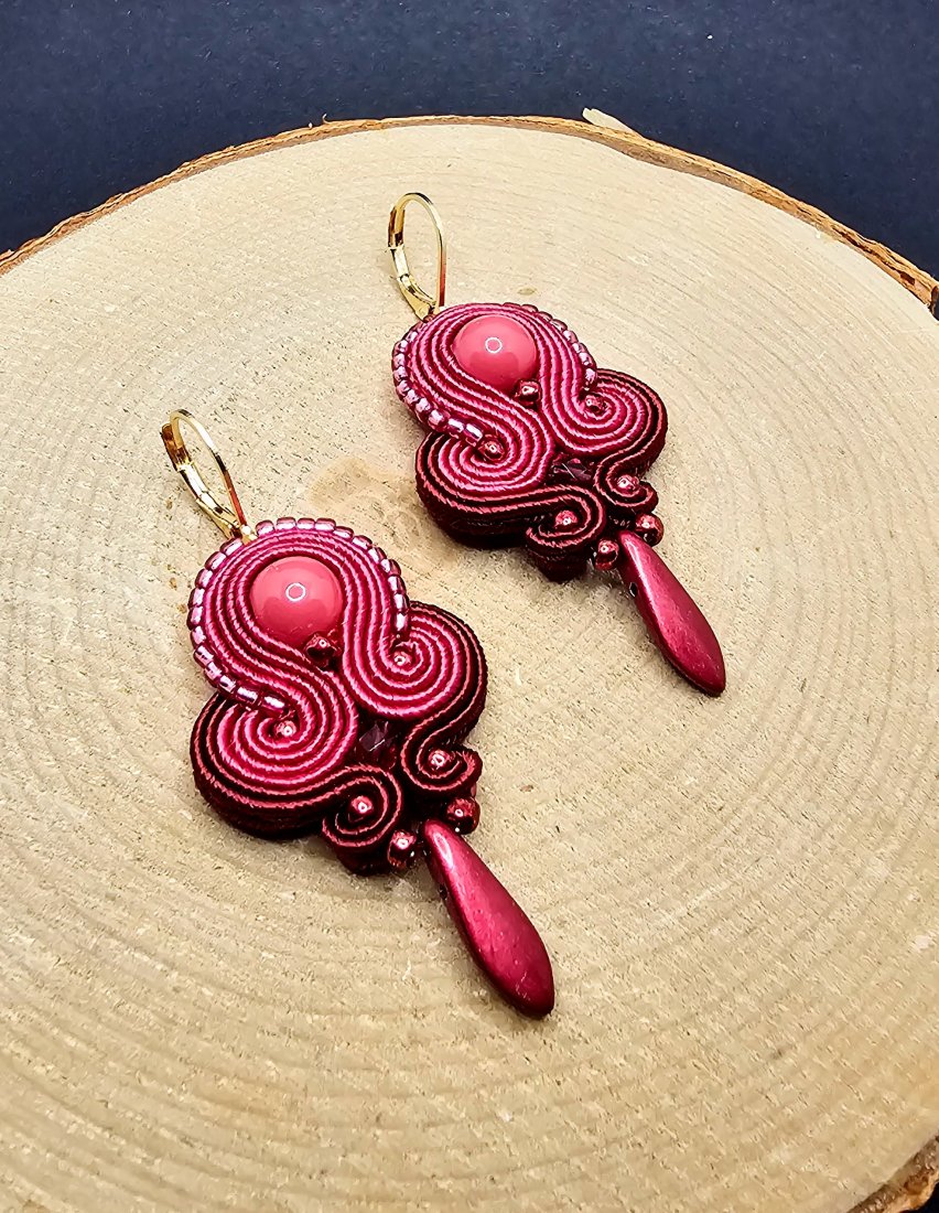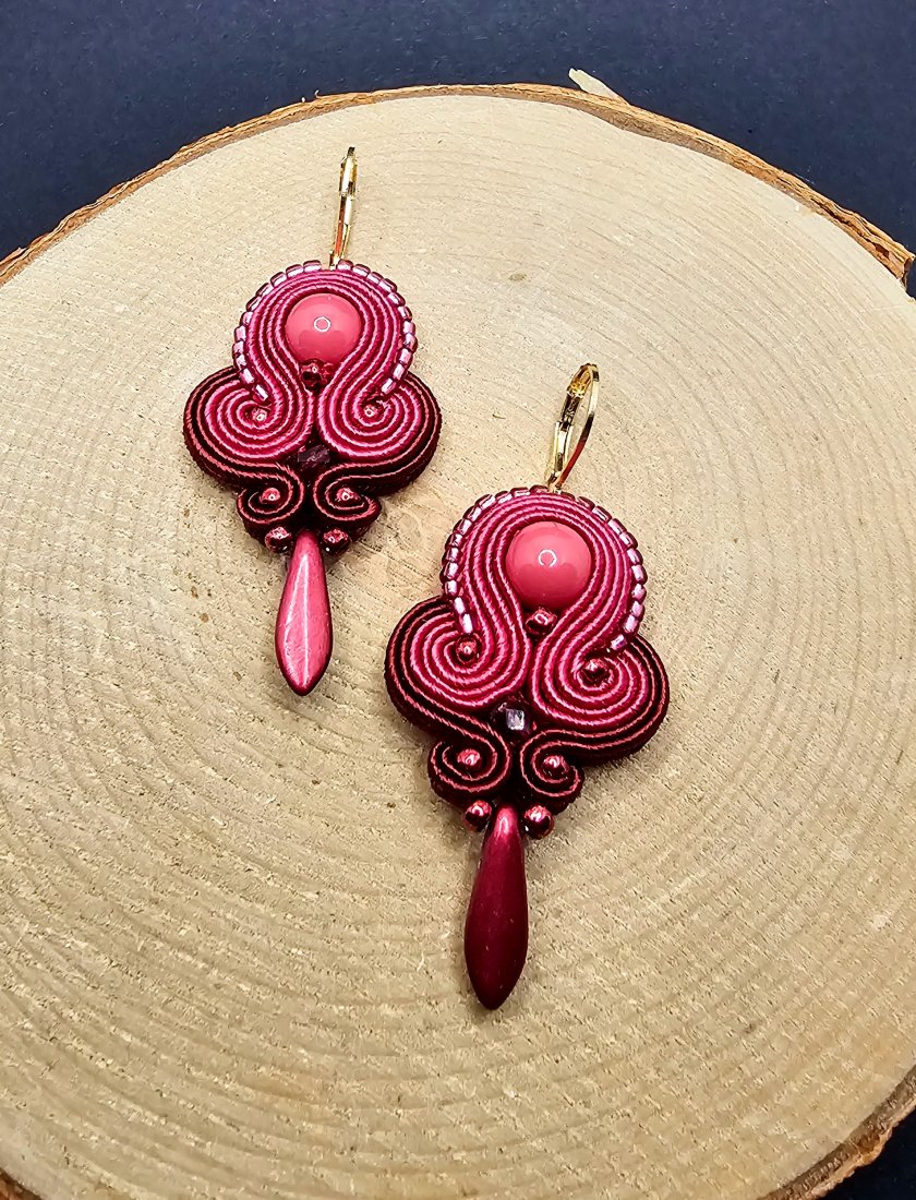 Różowe szklane kulki otoczone sznurkami sutasz oraz szklanymi czeskimi i japońskimi koralikami o rożnych kształtach i wielkościach. Dół kolczyków zdobią szklane wiszące koraliki w kolorze bordowym o satynowym wykończeniu. Kolczyki zawieszone na biglach angielskich w kolorze różowego złota.