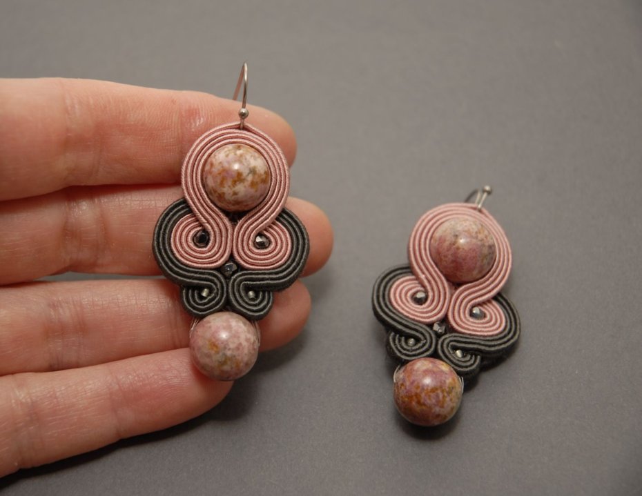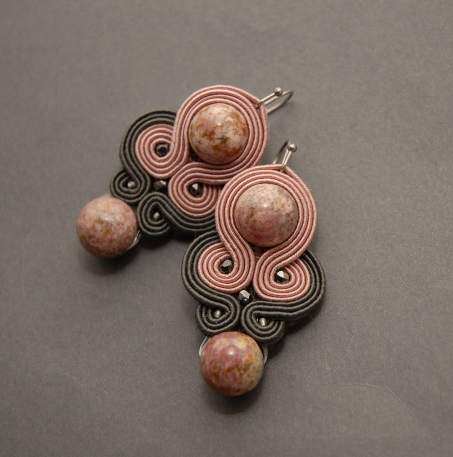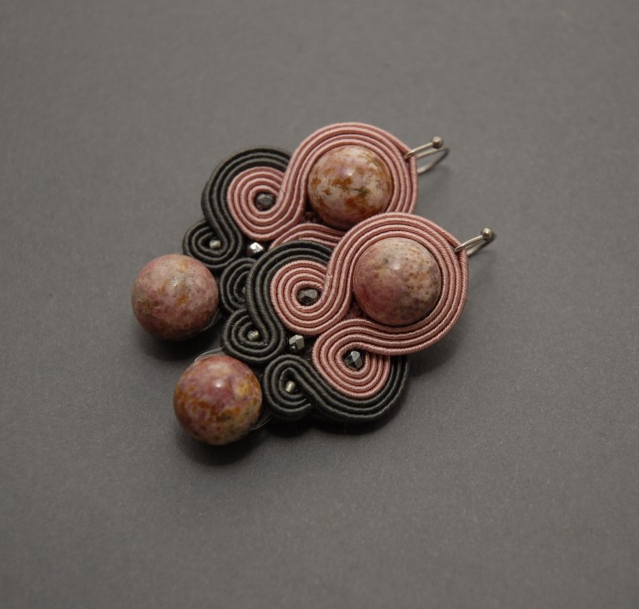 Kolczyki zrobione techniką sutasz, ozdobione rodonitami i drobnymi koralikami