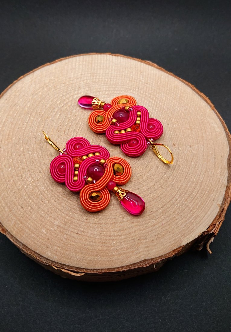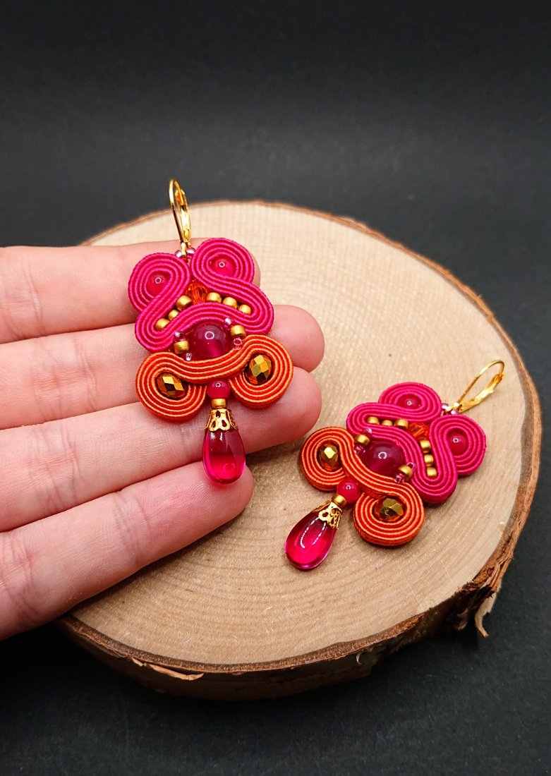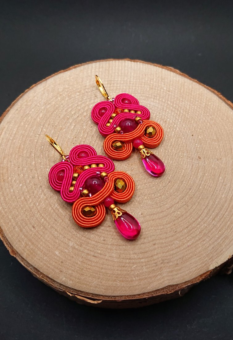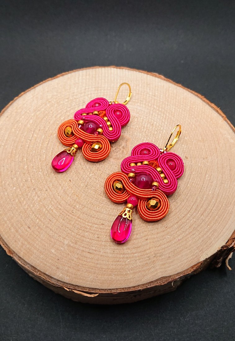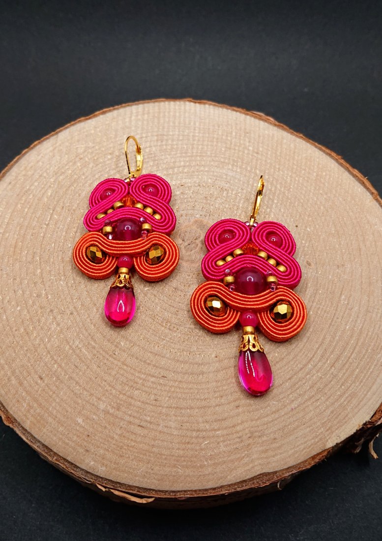 Kulki jadeitu w kolorze fuksji otoczone sznurkami sutasz, szklanymi koralikami w odcieniach złota i różu o różnych wielkościach. Dół kolczyków zakończony szklanymi kroplami w złotych ozdobnych czapeczkach. Kolczyki zawieszone na metalowych biglach angielskich w kolorze złotym.