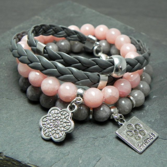 Trzy bransoletki stanowiące komplet (dwie z kamieni na gumce jublerskiej i skórzany warkoczyk podwójnie oplatany) wykonanych z kul jadeitu (8 mm), ekoskóry oraz elementów w kolorze srebrnym. Bransoletki będą pasowały na nadgarstek 15-16,5 cm.