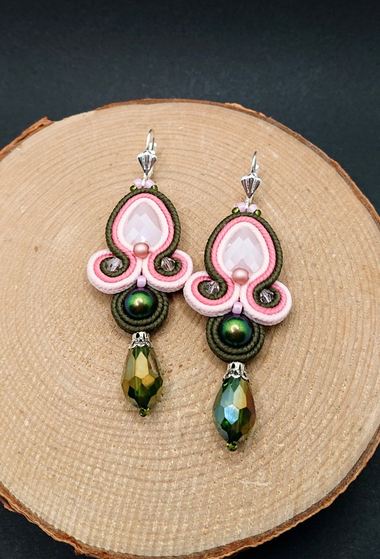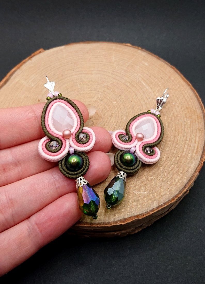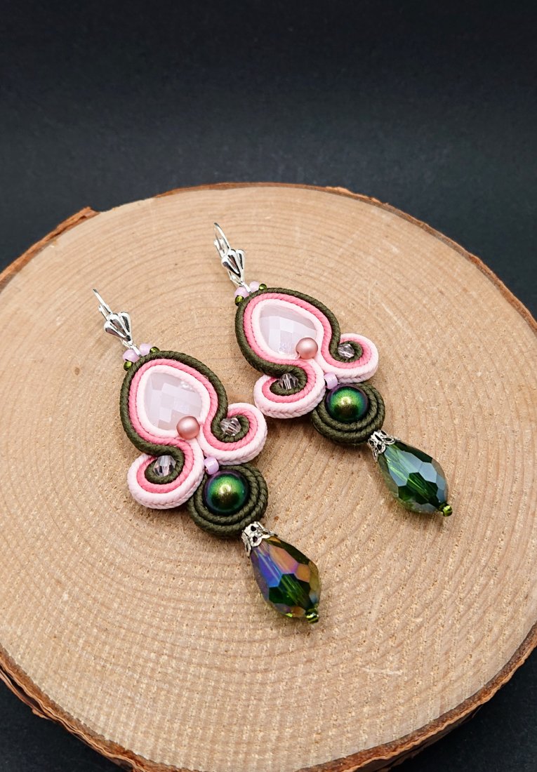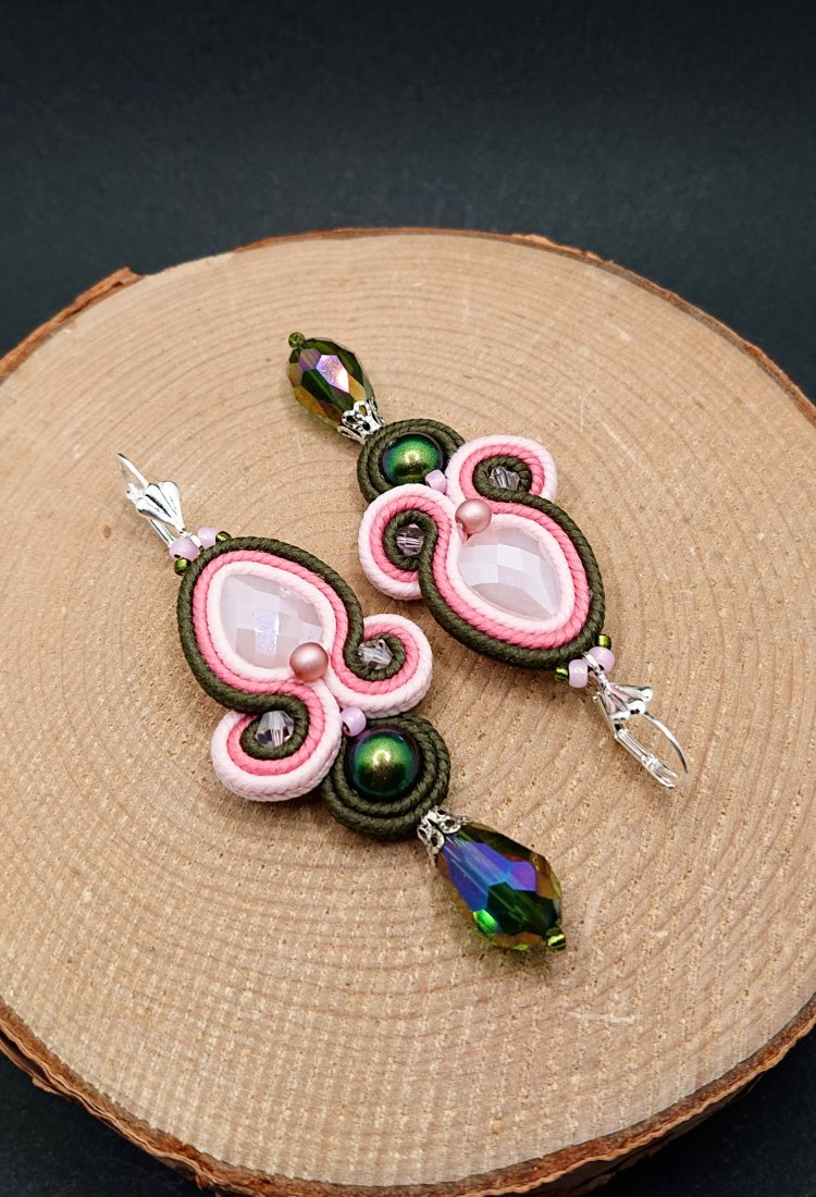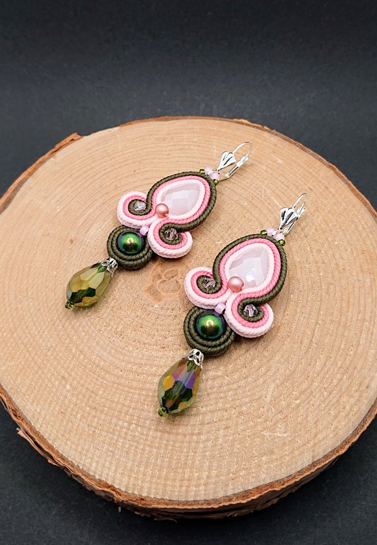Fasetowane kryształki w kolorze jasnego różu otoczone polskimi sznurkami sutasz w odcieniach różu i zieleni oraz czeskimi i japońskimi szklanymi koralikami. Dół kolczyków zdobią wiszące opalizujące szklane krople. Kolczyki zawieszone na ozdobnych biglach angielskich w kolorze srebrnym.