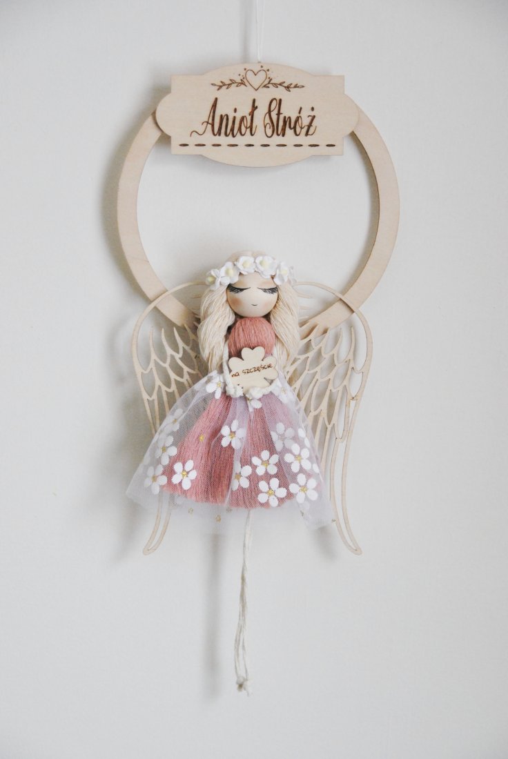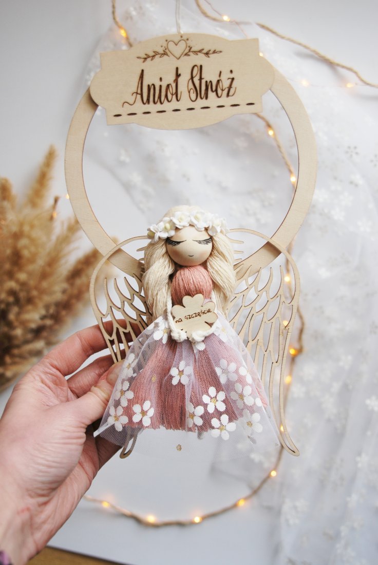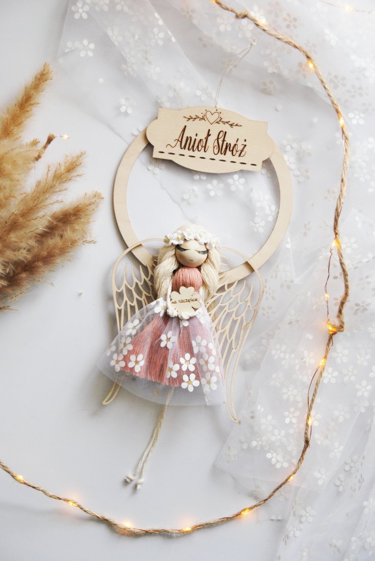 Ten uroczy Aniołek Stróż wykonany z dbałością o każdy szczegół to nie tylko piękna ozdoba, ale również symbol opieki, miłości i bezpieczeństwa. Osadzony na delikatnej, drewnianej obręczy, aniołek zachwyca swoją lekkością i spokojem.