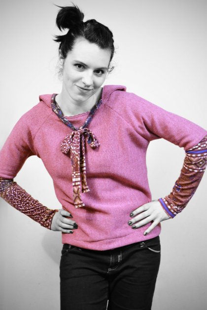 Bluza wykonana została z różowej dzianiny (dzianina swetrowa, od lewej strony miękka, przyjemna w dotyku). Rękawki i wykończenie kaptura wykonane z cieńszej, elastycznej dzianiny we wzorki. Prosty krój, bardzo wygodna i ciepła z dużym wiązanym z przodu kapturem. Rozmiar M