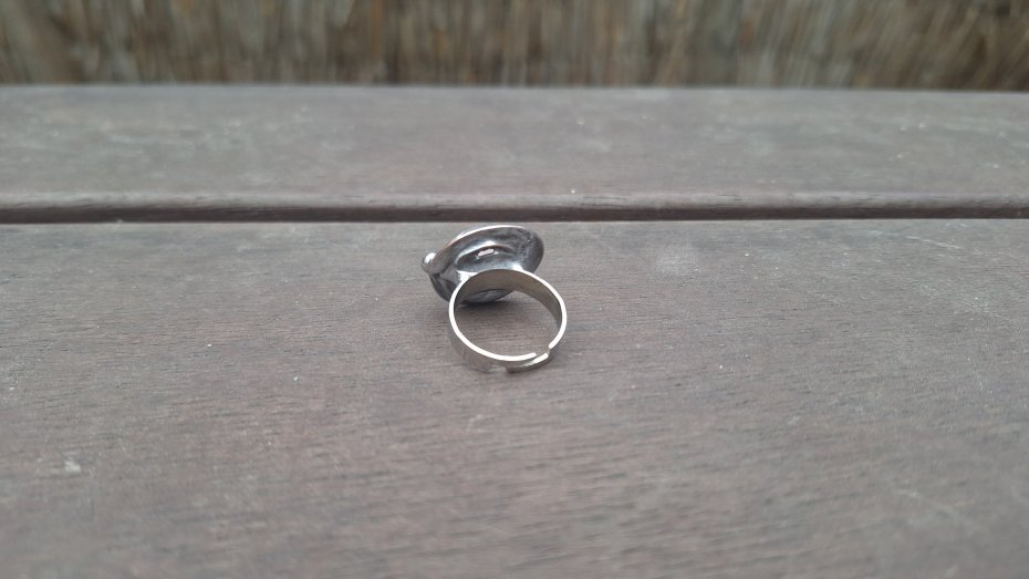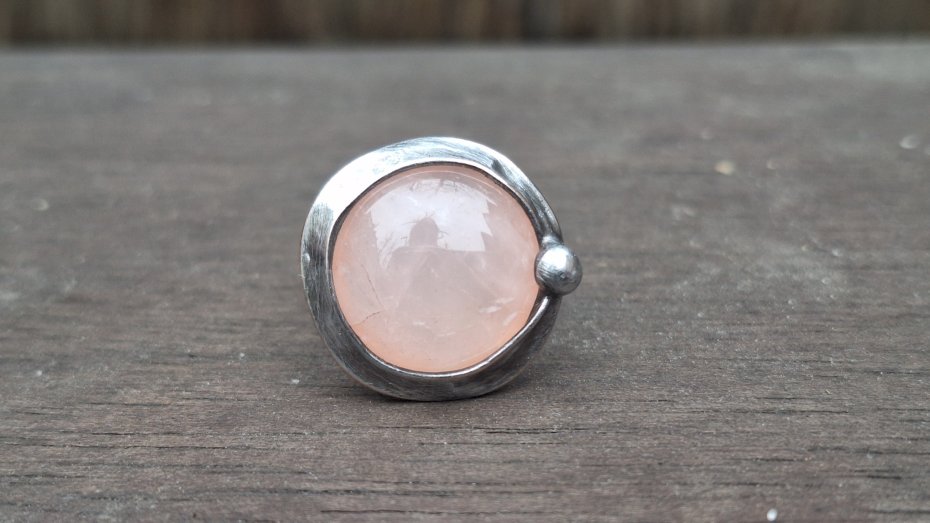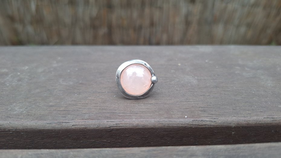 Pierścionek wykonany z miedzi, cyny i różowego kwarcu. Wymiary ok. 1.8 na 1.8 cm. Regulowany. Nie jest ciężki.