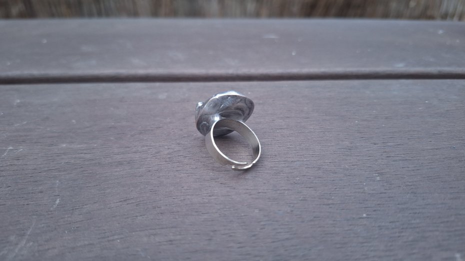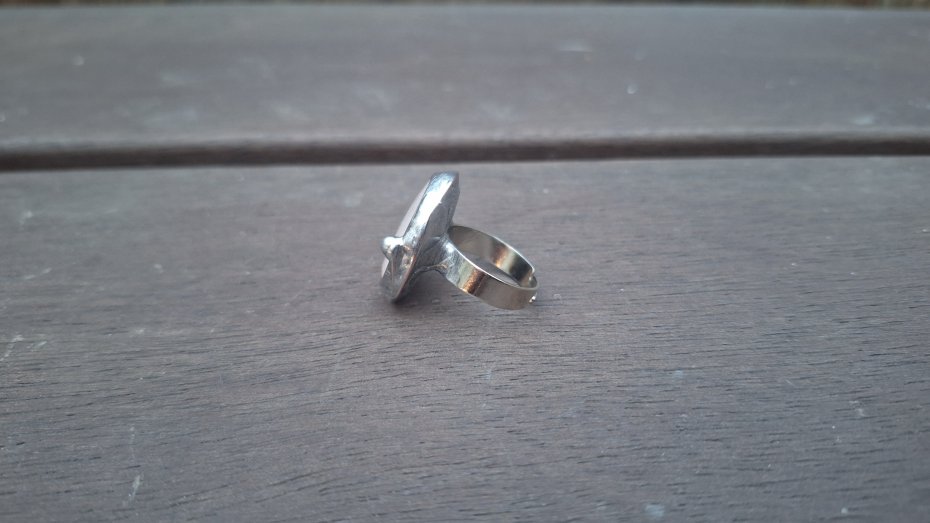 Pierścionek wykonany z miedzi, cyny i różowego kwarcu. Wymiary ok. 2.2 na 1.8 cm. Regulowany. Nie jest ciężki.
