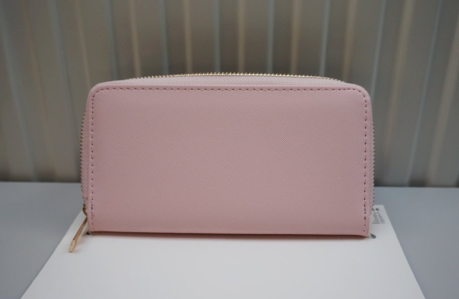 Damski portfel zapinany na suwak. Wewnątrz trzy duże przegrody na banknoty i jedna na bilon, zapinana na suwak. Ponadto miejsce na karty i inne drobiazgi. Wierzchnia strona - 60% poliuretan, 40% poliester. Kolor różowy. Nowy. Stan bardzo dobry.