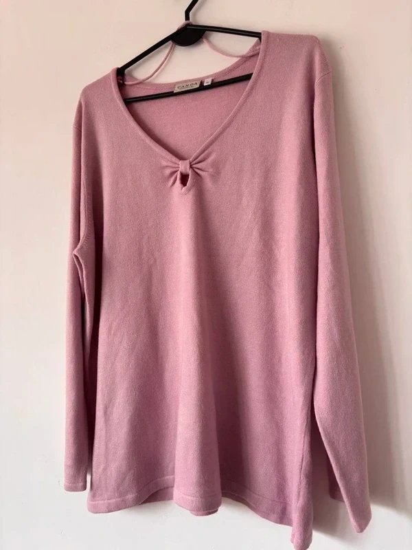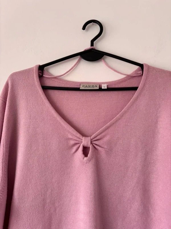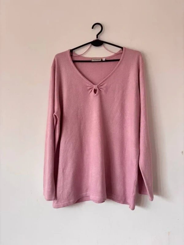 Delikatny różowy sweter z ozdobnym wiązaniem przy dekolcie.