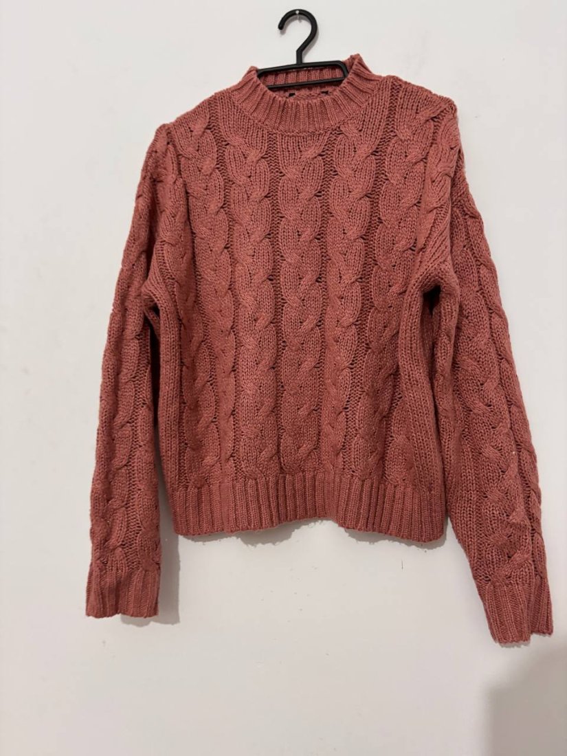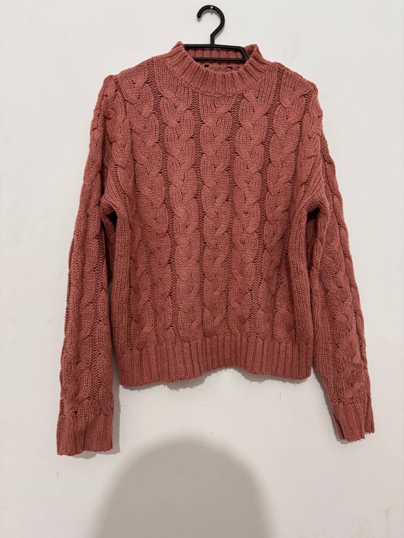 pink sweater, cable knit sweater, chunky knit, oversized sweater, warm sweater, winter sweater, fall sweater, soft knit, textured sweater, casual knitwear, knitted pullover, stylish sweater, everyday sweater, thick knit sweater, cozy knit, feminine sweater, pastel sweater, cable pullover, knit top, comfy sweater