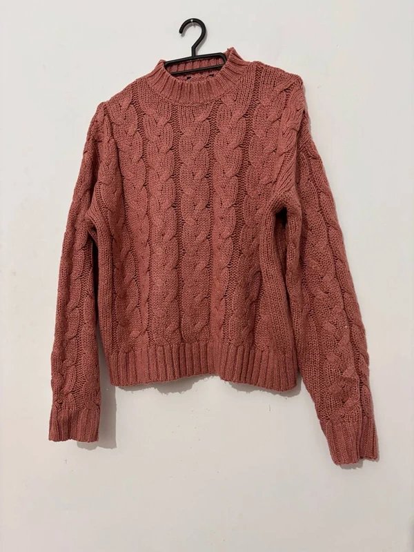 pink sweater, cable knit sweater, chunky knit, oversized sweater, warm sweater, winter sweater, fall sweater, soft knit, textured sweater, casual knitwear, knitted pullover, stylish sweater, everyday sweater, thick knit sweater, cozy knit, feminine sweater, pastel sweater, cable pullover, knit top, comfy sweater