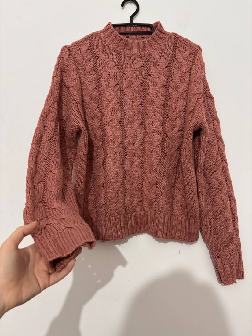 pink sweater, cable knit sweater, chunky knit, oversized sweater, warm sweater, winter sweater, fall sweater, soft knit, textured sweater, casual knitwear, knitted pullover, stylish sweater, everyday sweater, thick knit sweater, cozy knit, feminine sweater, pastel sweater, cable pullover, knit top, comfy sweater