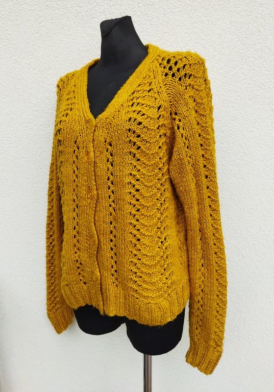 Sweter typu kardigan dziergany na drutach z lekko ażurowym wzorem z włóczki w miodowo-musztardowym kolorze. Raglanowe rękawy, dekolt w szpic. Zapinany na guziki. Wykończony ściągaczami.