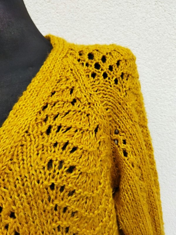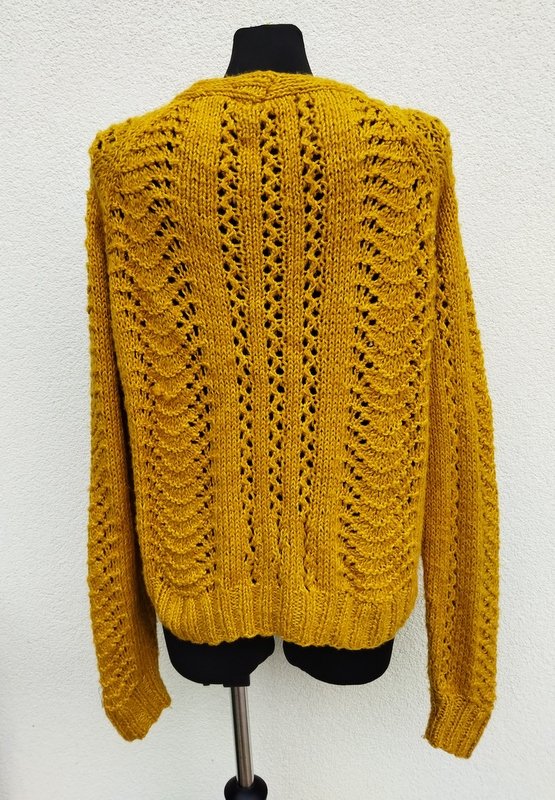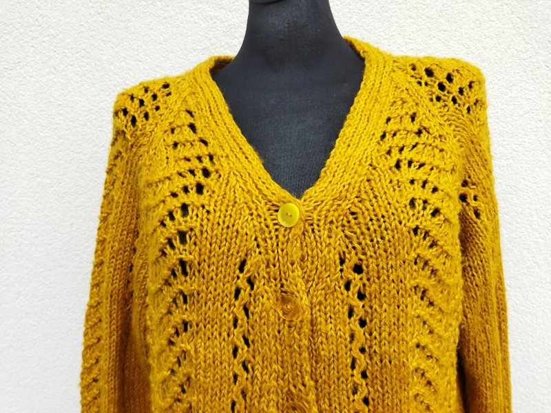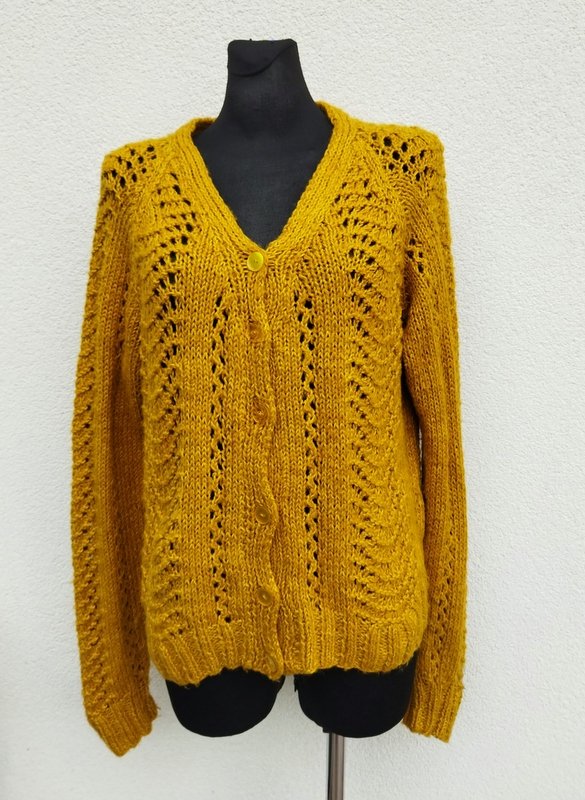 Sweter typu kardigan dziergany na drutach z lekko ażurowym wzorem z włóczki w miodowo-musztardowym kolorze. Raglanowe rękawy, dekolt w szpic. Zapinany na guziki. Wykończony ściągaczami.