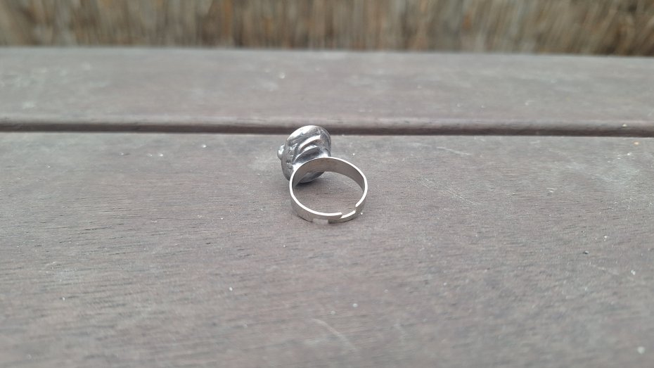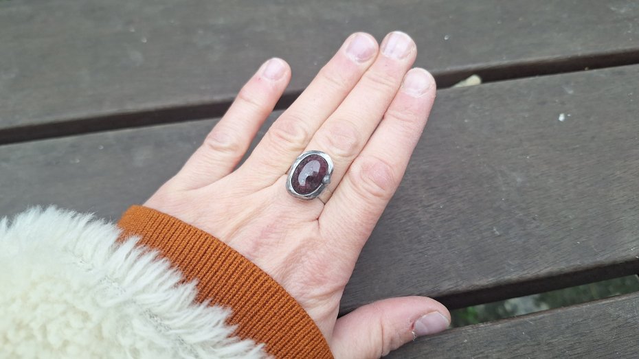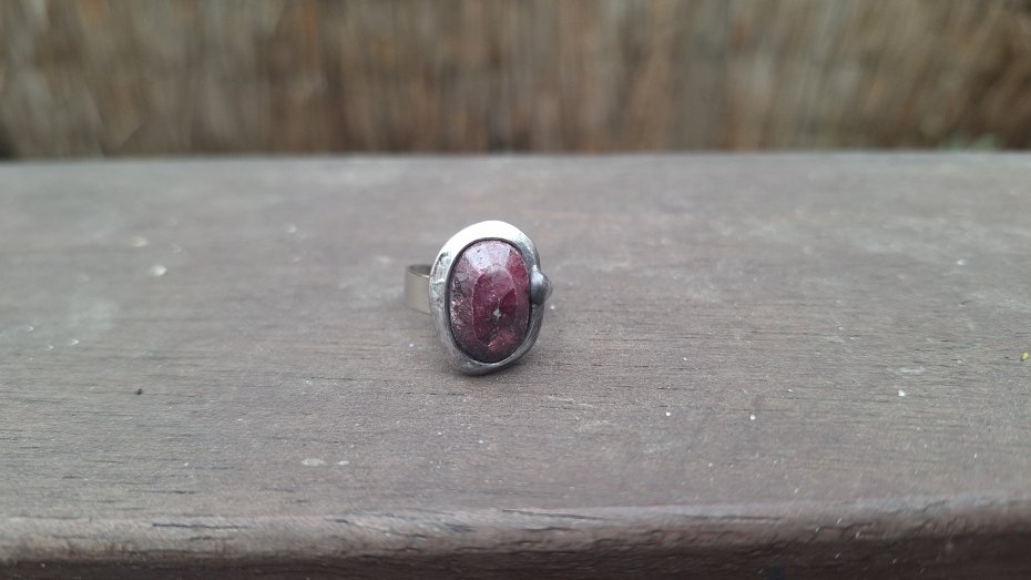 Pierścionek wykonany z miedzi, cyny i rubinu. Wymiary ok. 1.8 na 1.2 cm. Regulowany. Nie jest ciężki.