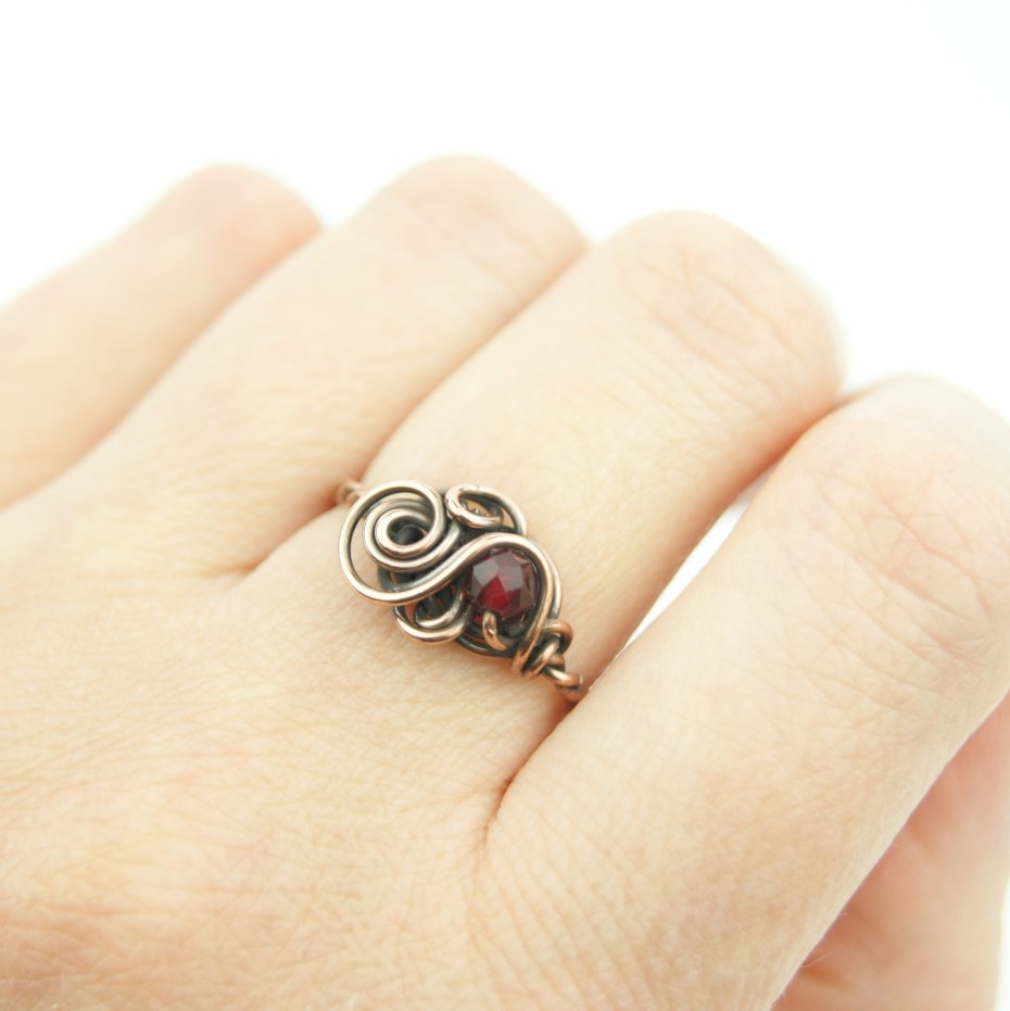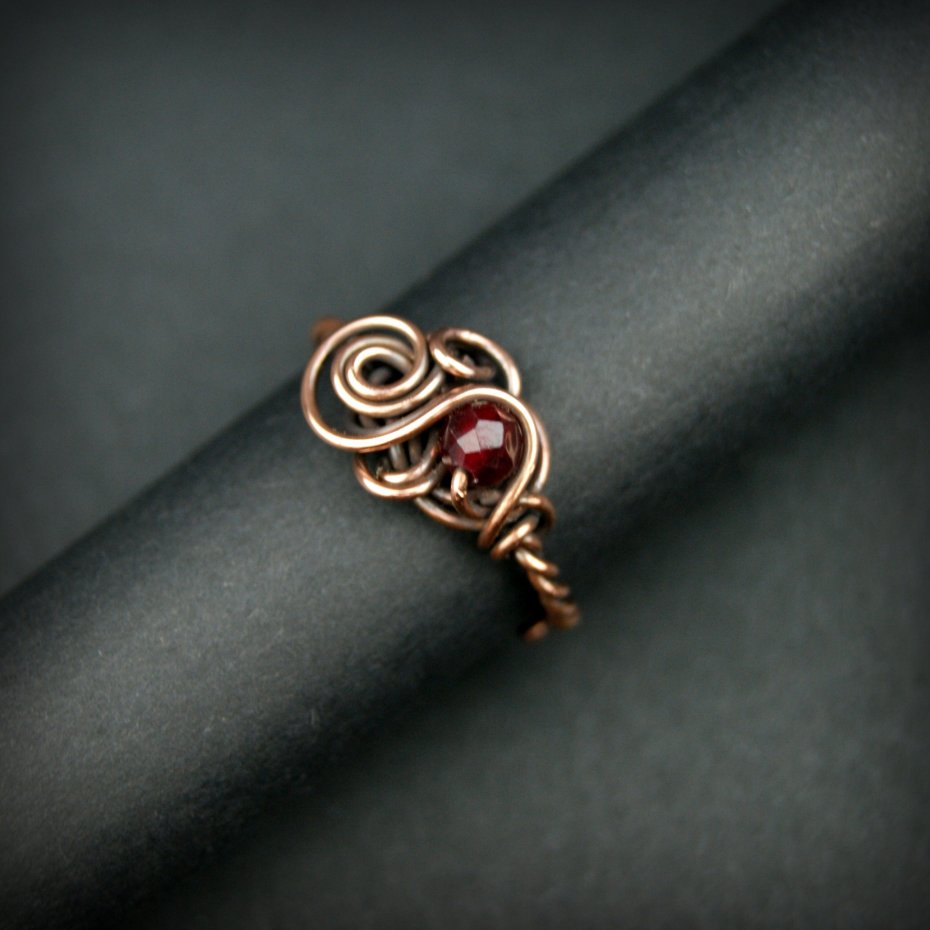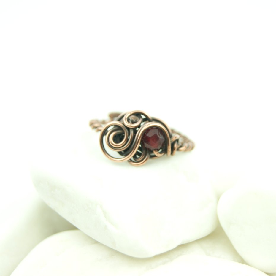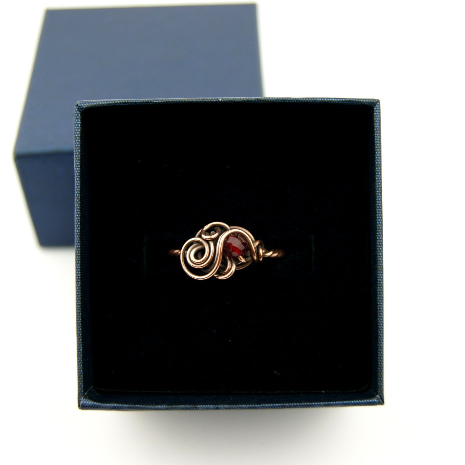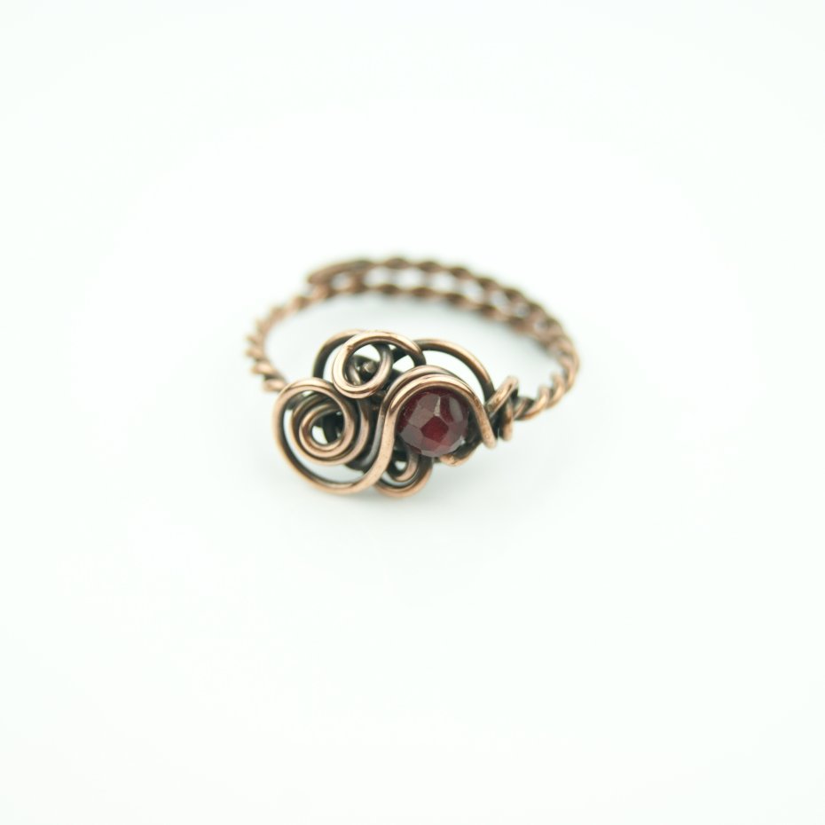Pierścionek wykonany w pracochłonnej technice wire wrappingu. Centralnym punktem jest tu rubin, który został misternie opleciony miedzią. Pierścionek w uniwersalnym rozmiarze, możliwość regulacji.
