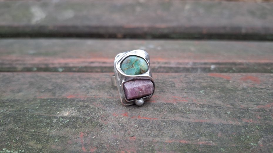Pierścionek wykonany z miedzi, cyny, chryzoprazu i rubinu. Wymiary ok. 2.2 na 1.6 cm. Regulowany. Nie jest ciężki.