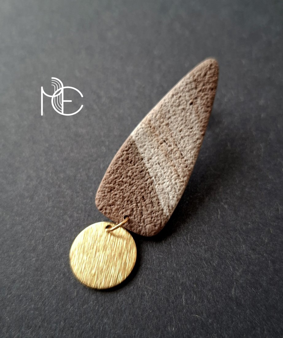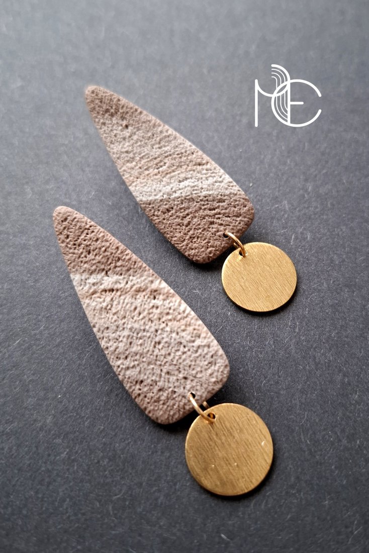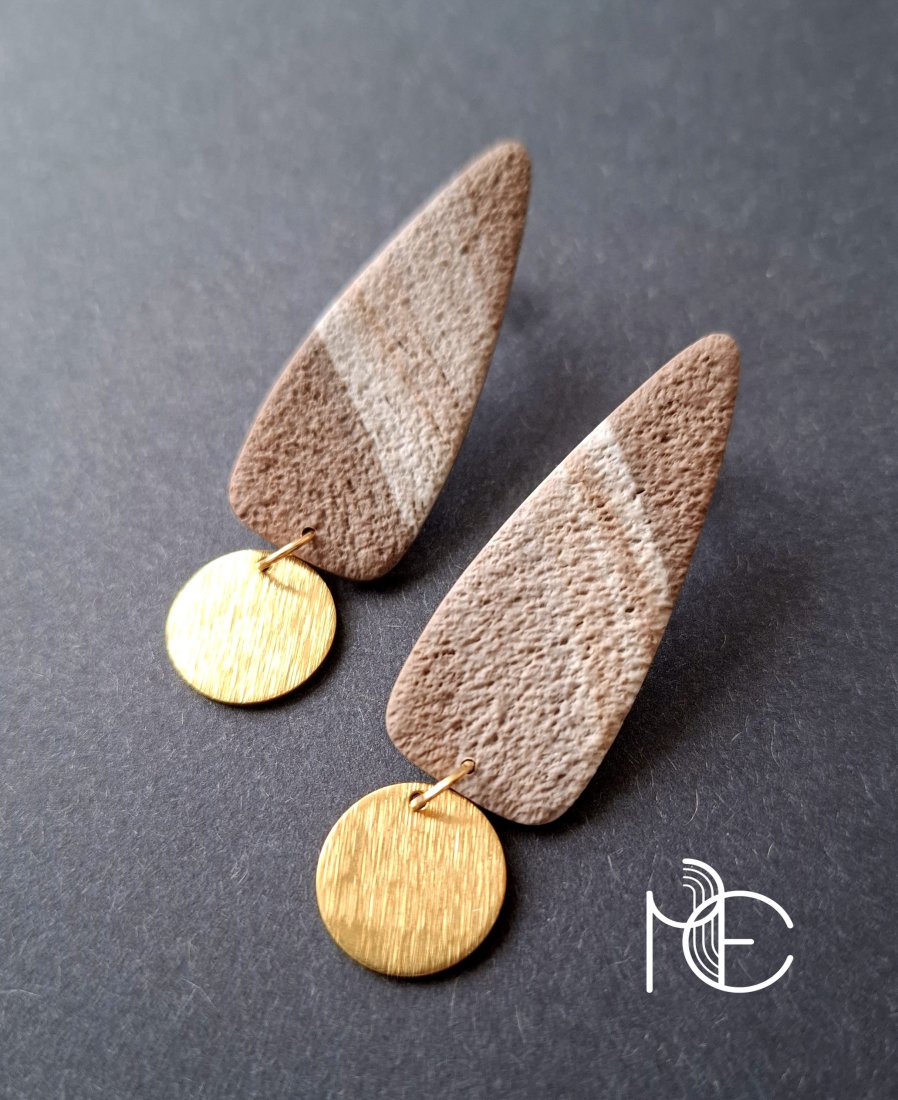 Kolczyki na sztyfty wykonane z wysokiej jakości glinki polimerowej z dodatkiem ozdobnych elementów metalowych. Jednostronne z pozłacanymi, nieuczulającymi sztyftami. Wymiary: długość całkowita: 6,1 cm; szerokość max. 1,7 cm. Wykonane w jedynym egzemplarzu.