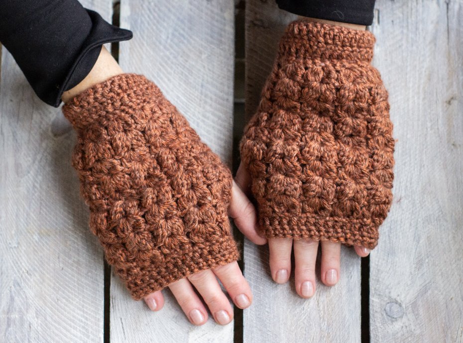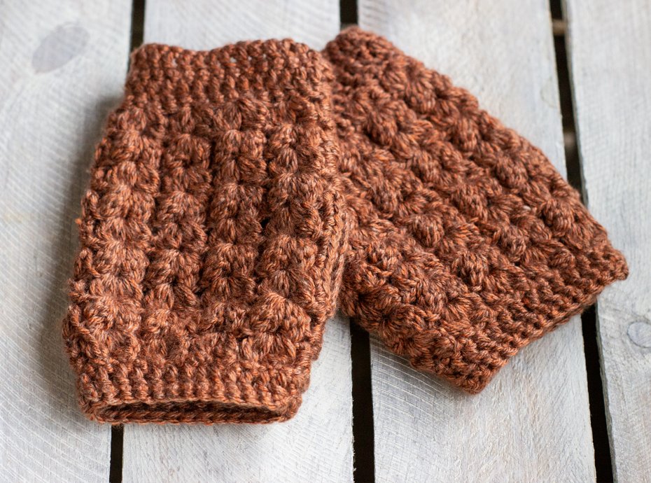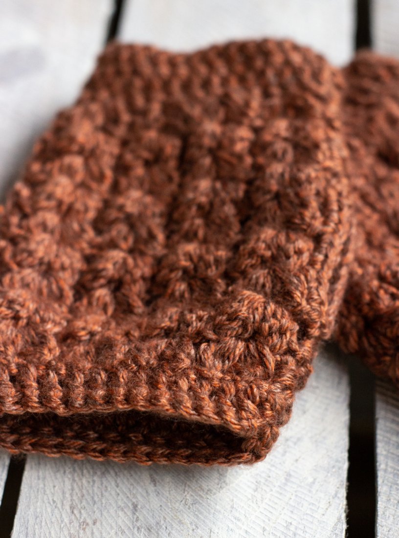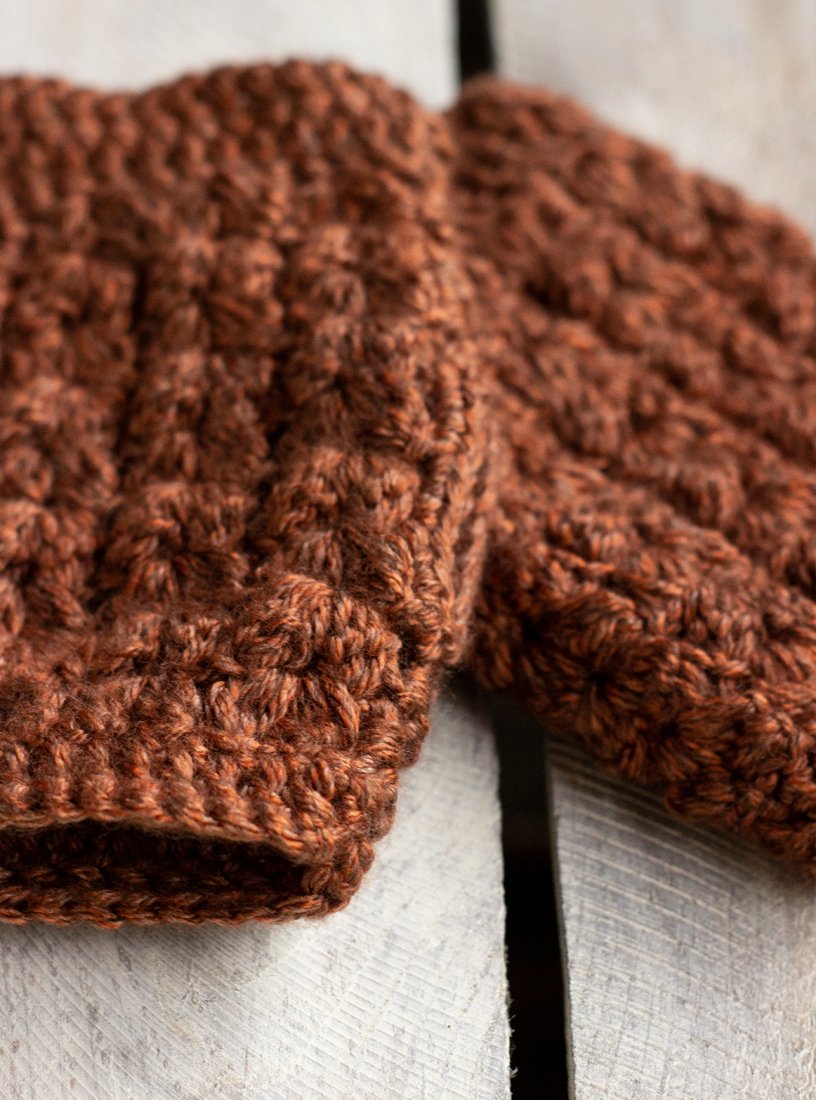 Rękawiczki - mitenki wydziergane na szydełku. Całość zrobiona z włóczki himalaya anti - pilling, melanż rudo - brązowy. Prać ręcznie w 40 st.
