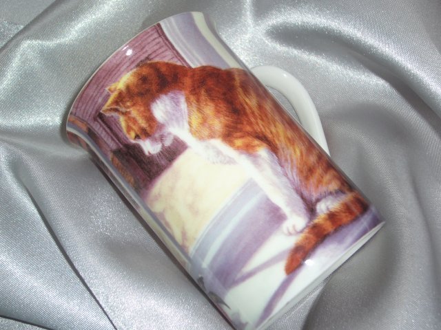 Uroczy porcelanowy kubek z motywem kotka, sygnowany.