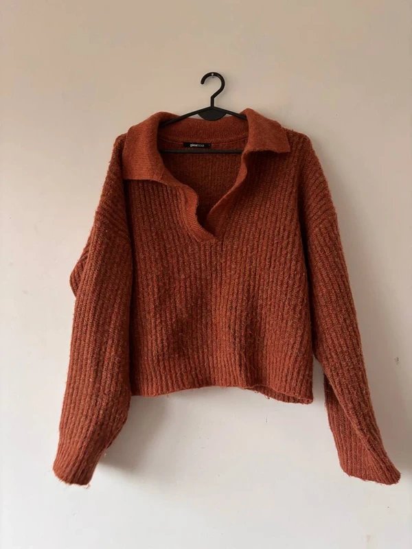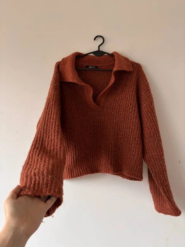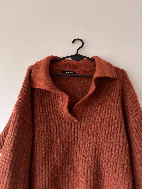 Rudy sweter marki Gina Tricot z kołnierzykiem polo i dekoltem V w stylu casual. Miękka, puszysta dzianina , krótki krój, idealny na jesień.