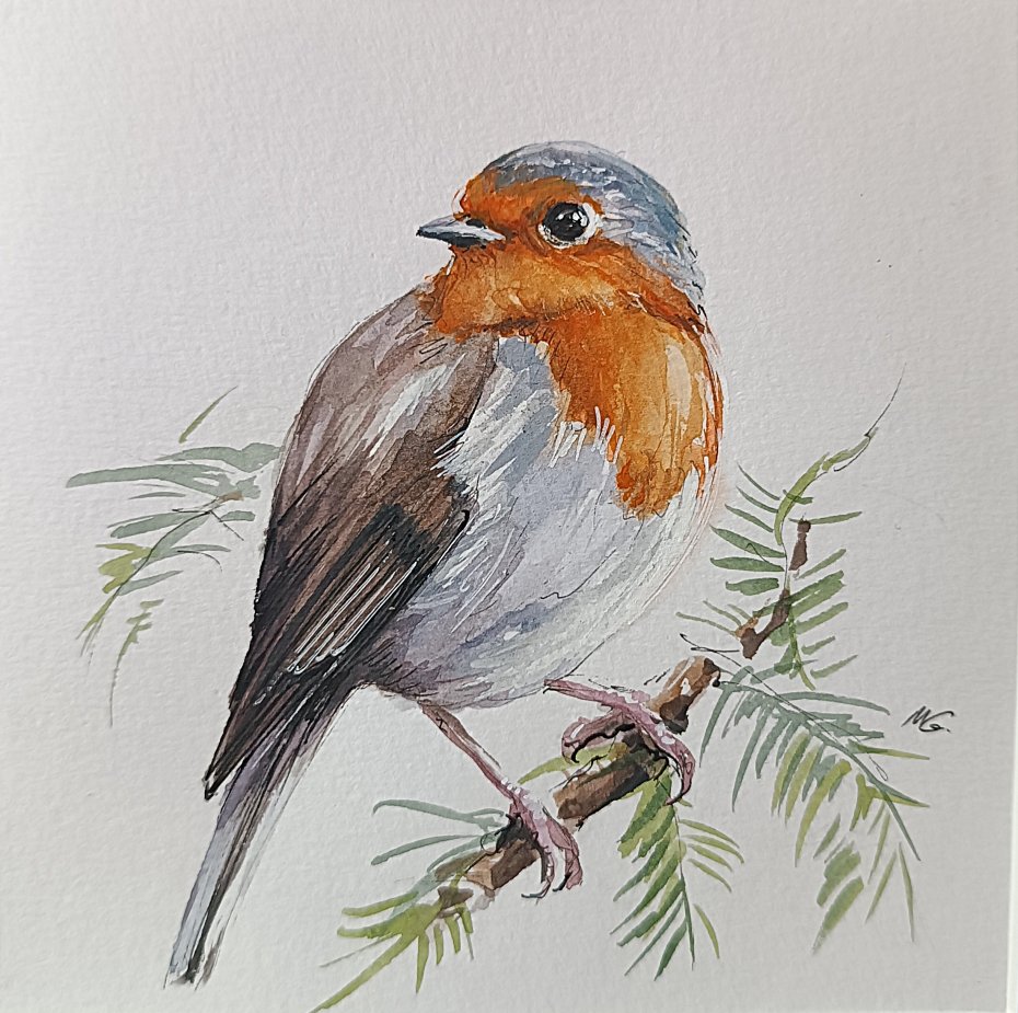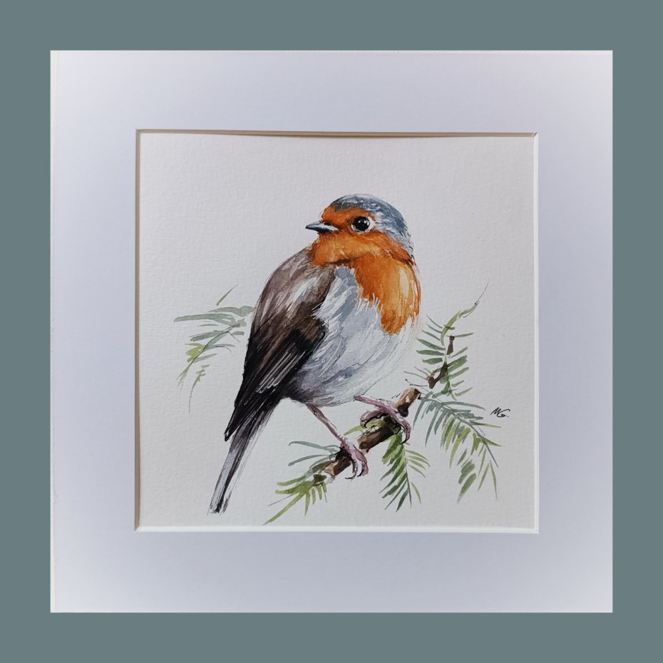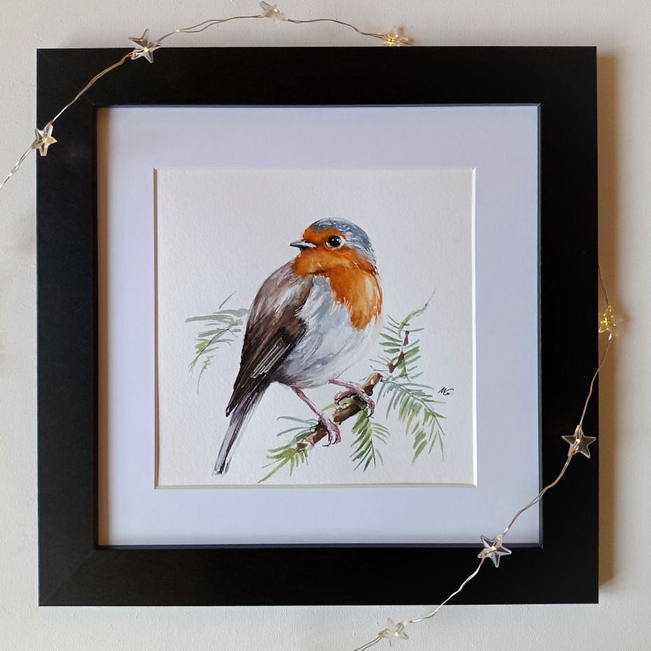 "Rudzik na gałązce" - unikatowa ręcznie malowana akwarela, oryginał. Namalowana na papierze 250g farbami Derwent, z użyciem cienkopisów Winsor & Newton i gellpen Sakura i Posca. Akwarela jest oprawiona w passe-partou w ramie MDF za szkłem, przeznaczona do powieszenia. Wymiary całości 24,3 x 24,3cm, okno passe-partou 13,7x13,17cm. Praca jest sygnowana inicjałami i podpisana na odwrocie. Gotowy prezent! Jedyny taki egzemplarz! Mam nadzieję,że przyniesie dużo radości nie tylko wielbicielom ptaków :-) Zapraszam! Monika