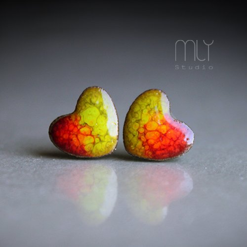 Ceramiczne kolczyki w formie sztyftów, ręcznie wykonane z delikatnej gliny kamionkowej, jednostronnie szkliwione mieszanką zielonych i pomarańczowo czerwonych szkliw z efektem plamek i subtelnym połyskiem, na sztyftach w kolorze srebrnym. Średnica ok. 12mm.Polecam
