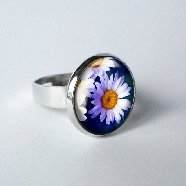 Oryginalny, nieduży, okrągły pierścionek z unikatową grafiką, umieszczoną pod szklanym kaboszonem (wypukłym szkiełkiem) i oprawioną w bazę w kolorze srebrnym (nie zawiera niklu i ołowiu, hipoalergiczna). Grafika jest wysokiej jakości, bardzo wyraźna i nasycona, wywołana na papierze fotograficznym.