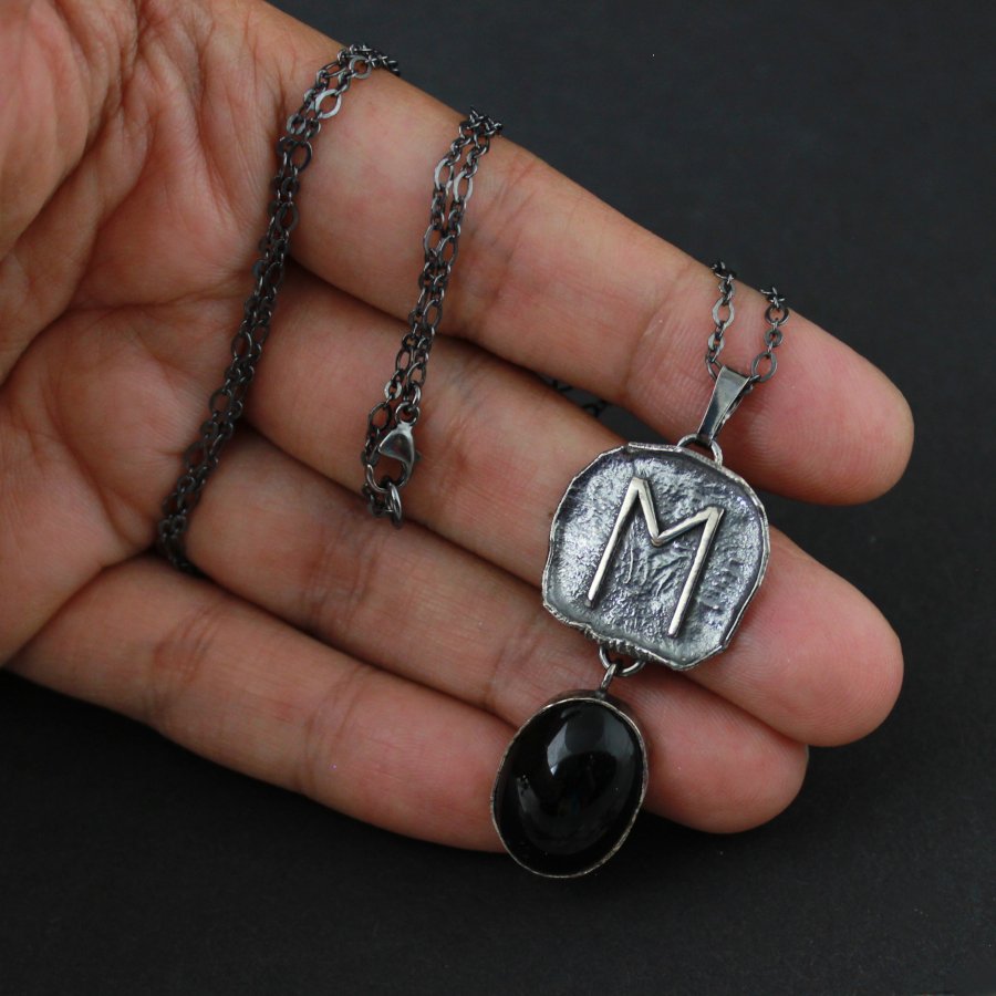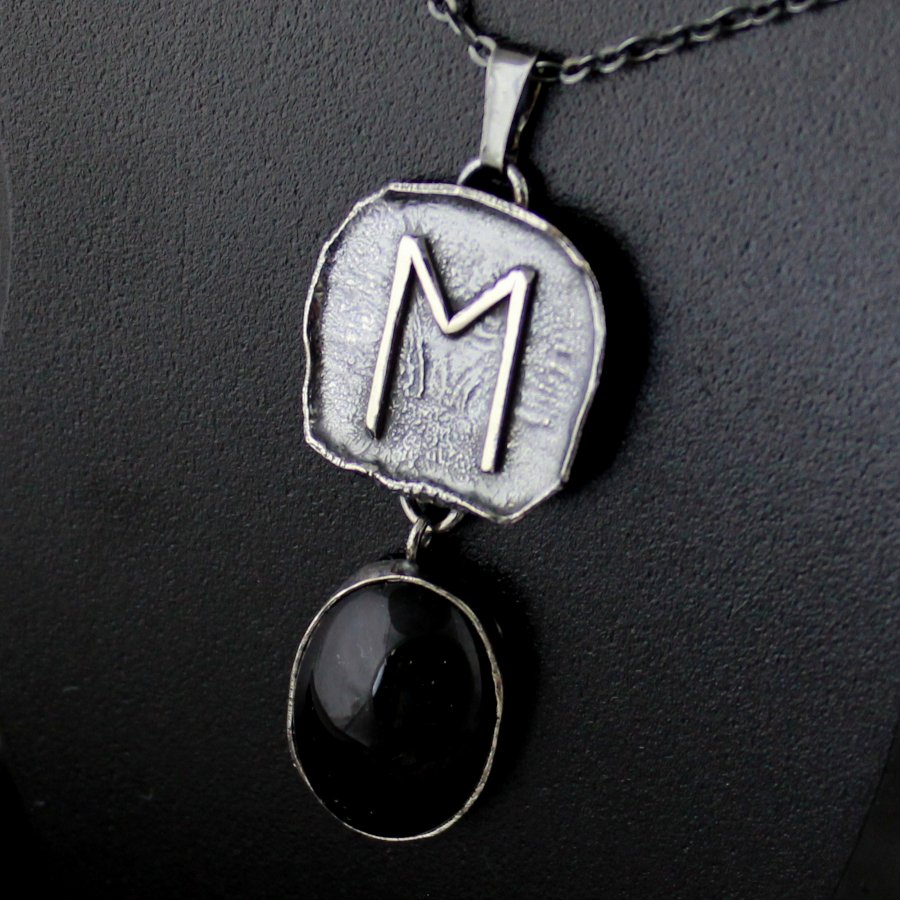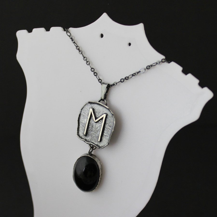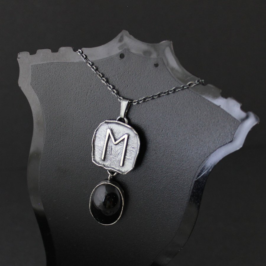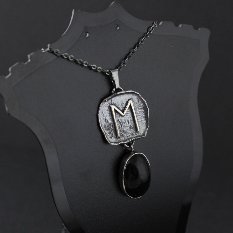 W centrum – runa Ehwaz, symbol partnerstwa i harmonii, runa wikingów i starogermańska runa drogi. Mówi o współpracy, zaufaniu i płynnym ruchu ku zmianie. Pod nią, w srebrnej oprawie, spoczywa onyks – kamień o czerni tak głębokiej, że zdaje się pochłaniać światło. Gładki, lśniący, o owalnym kształcie przypomina nocne niebo bez gwiazd – spokojne, lecz pełne mocy.