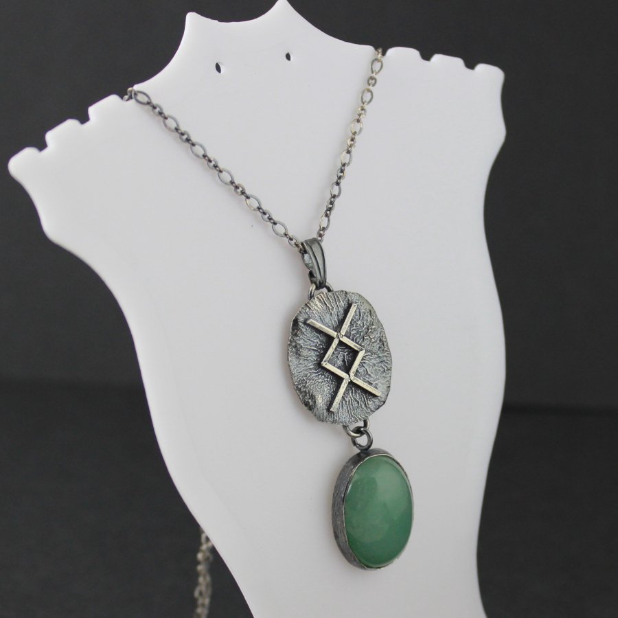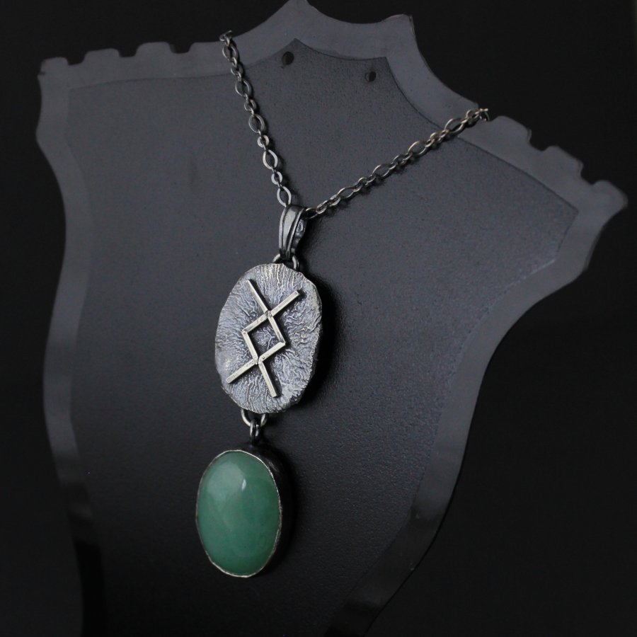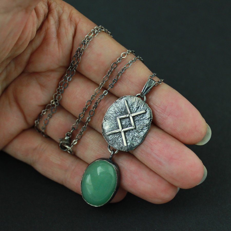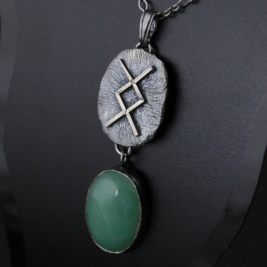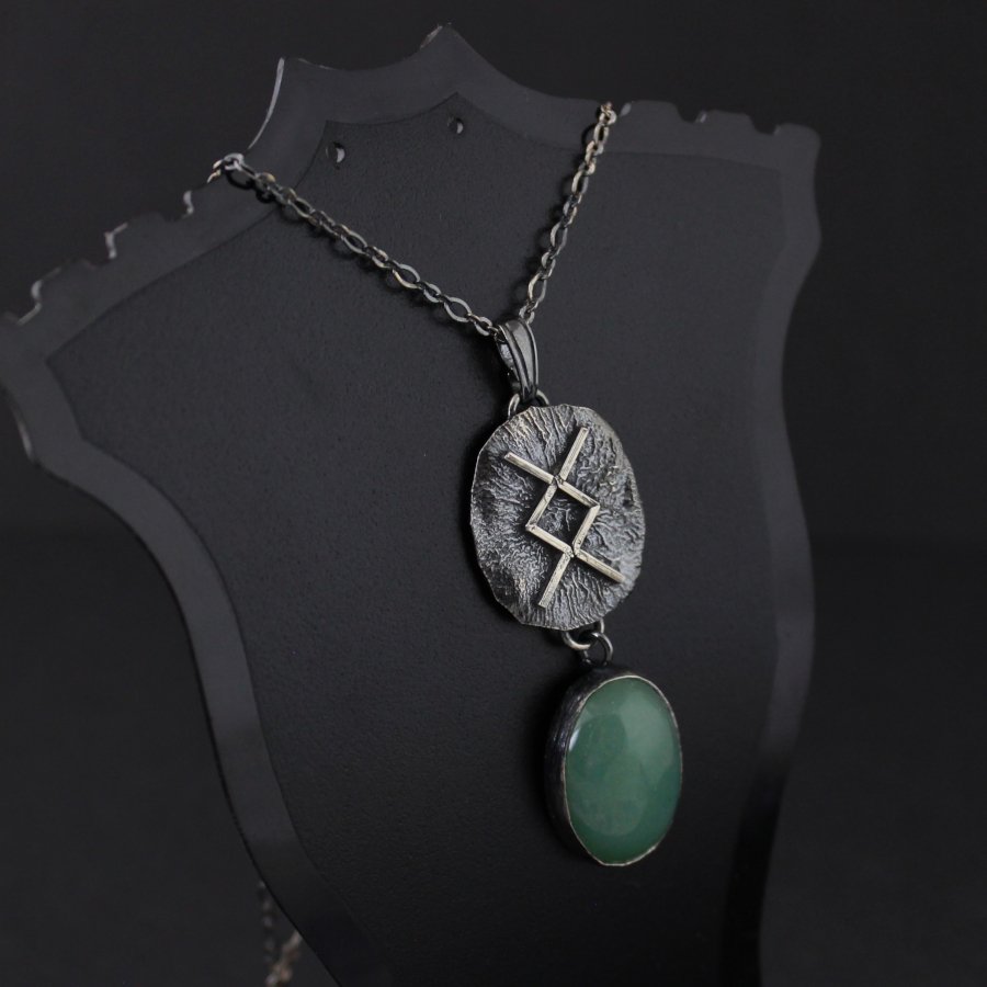 Ręcznie wykonany wisiorek, gdzie oksydowane srebro próby 925 spotyka miękką zielenią awenturynu. Gładki, owalny kamień ma barwę głębokiego listowia — mieszankę zieleni szałwii, mokrego mchu i ciepłego szmaragdu. Surowa blacha srebra, zmatowiona i miejscami wypolerowana, tworzy tło o tonach srebrnego, grafitowego i czarnego antracytu; na niej wyryta runa Ingwaz (znana też jako Inguz, Ing, Enguz) — prosty, geometryczny znak runy Ingwaz, runa wikingów i runa starogermańska — przypomina stempel odwagi i odnowy.