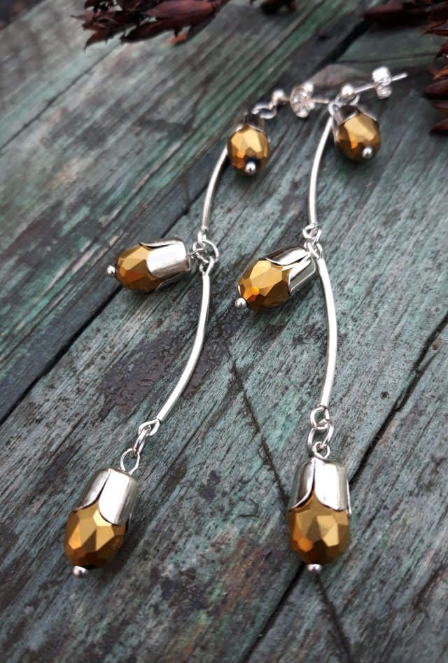 ,,rurki,, to niezwykle kobiece kolczyki wykonane z metalowych elementów i złotych szklanych koralików. Kolczyki zawieszone są na ozdobnych biglach typu sztyft w kolorze ciemnego srebra.
