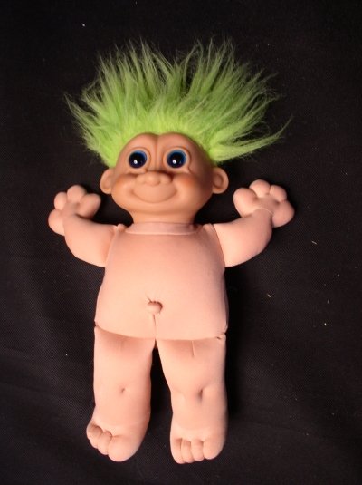 Lalka firmy RUSS TROLL.Charakterystyczna buzia i duże oczy.Buzia z twardego plastyku.Reszta szyta z materiału,miękka.Włosy zielone..Bez ubranka...Stan bardzo dobry-.Wysokość 31 cm.