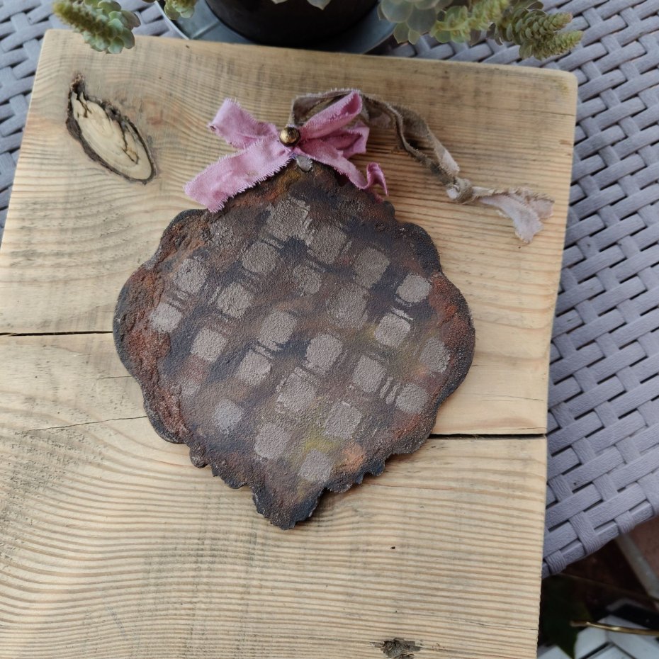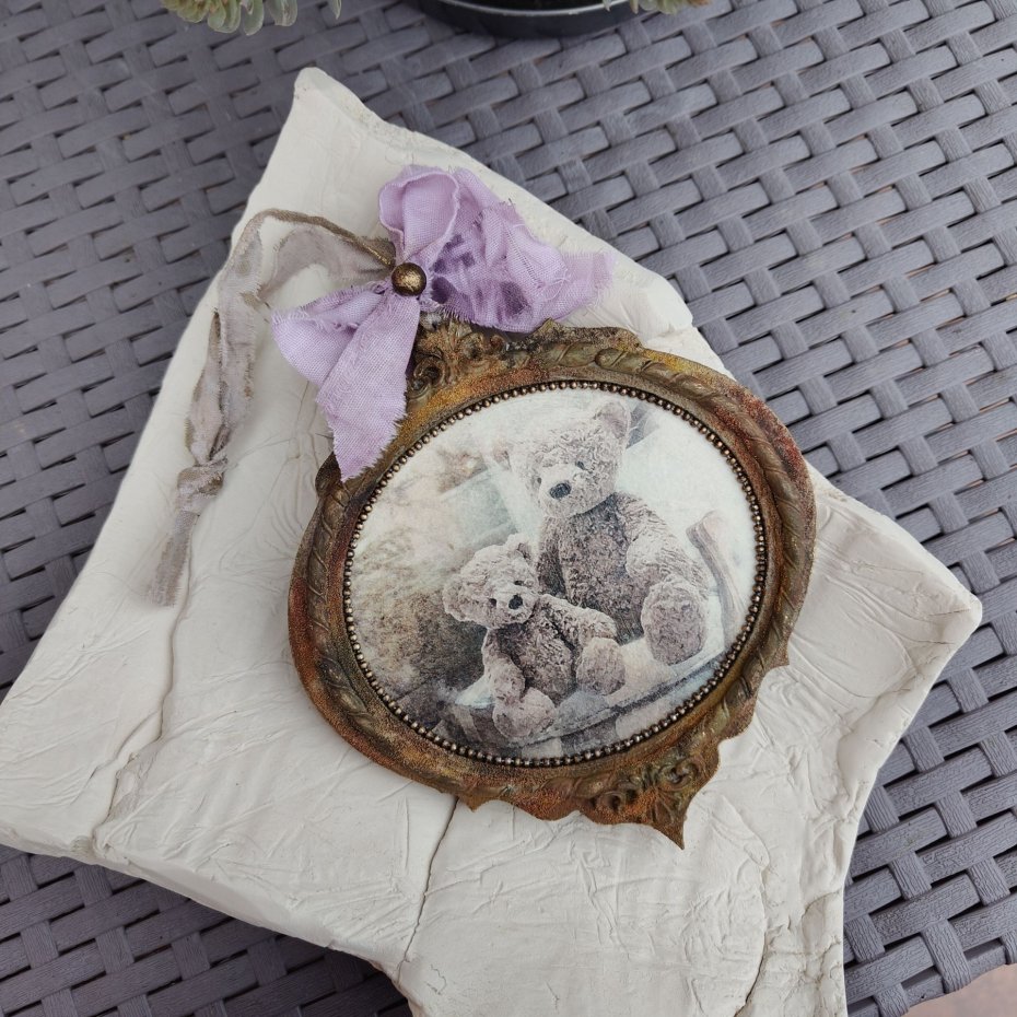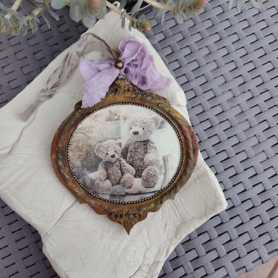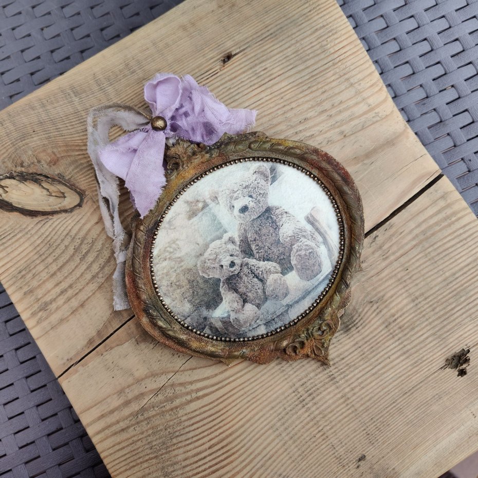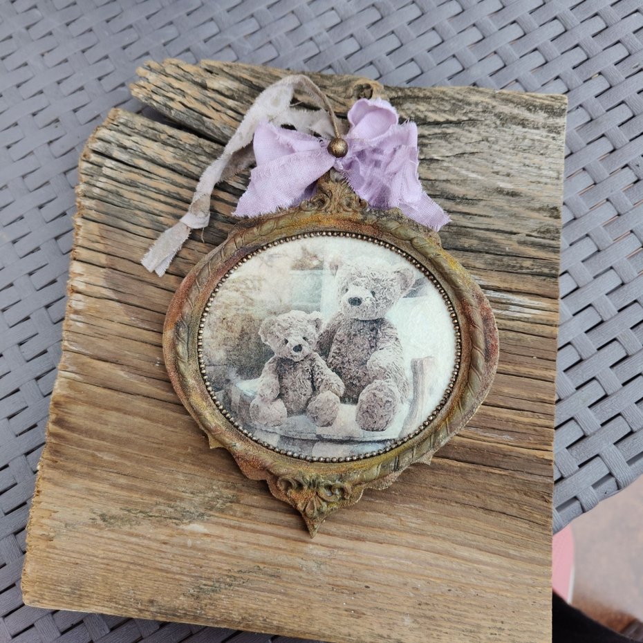 Wprowadź do swojego wnętrza nutę nostalgii dzięki tej wyjątkowej, ręcznie stylizowanej zawieszce w klimacie vintage. Centralnym punktem dekoracji jest uroczy pluszowy miś, umieszczony w postarzonej, owalnej ramce z efektem rdzy. Całość została osadzona na naturalnym, surowym drewnie o pięknej strukturze, które nadaje pracy niepowtarzalnego charakteru.
