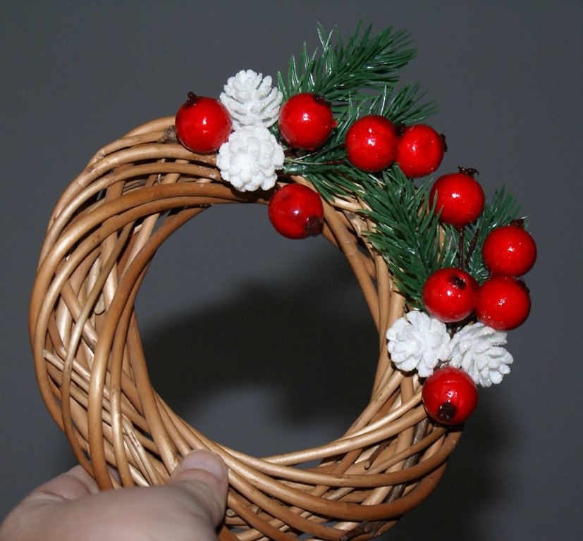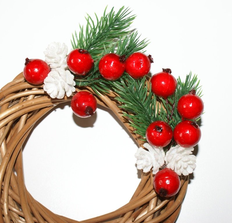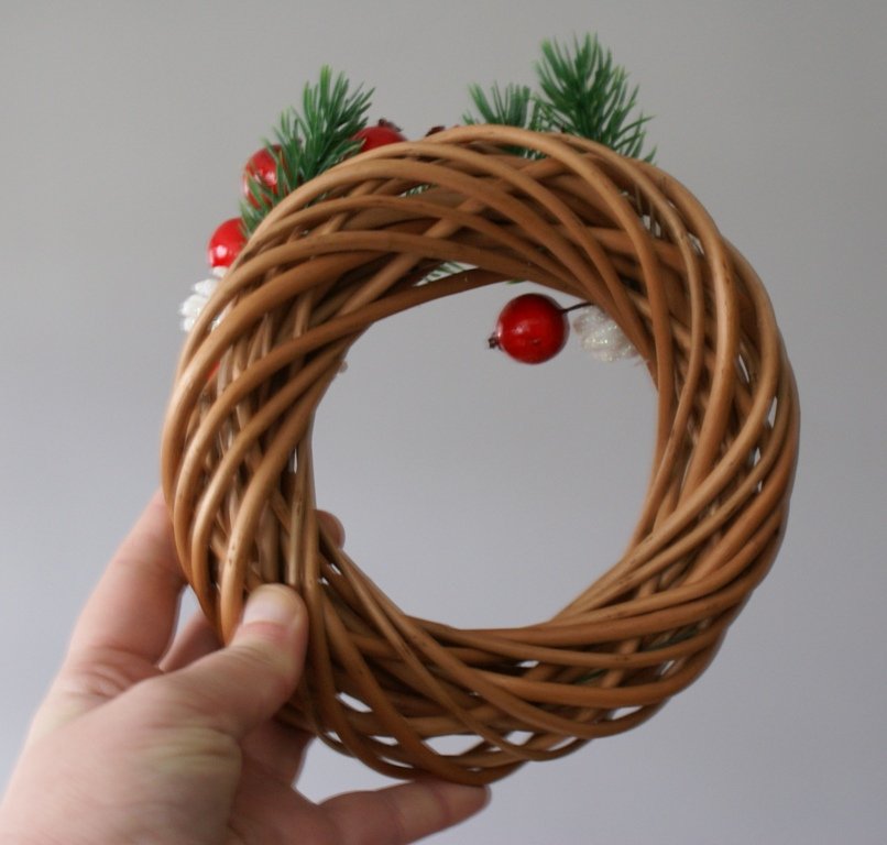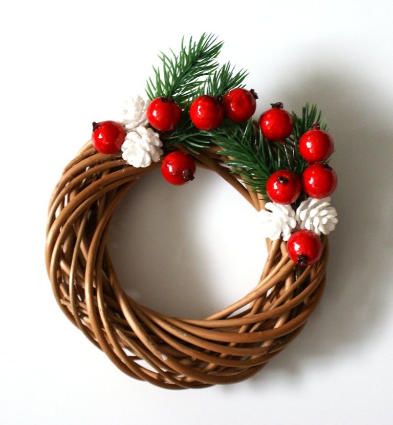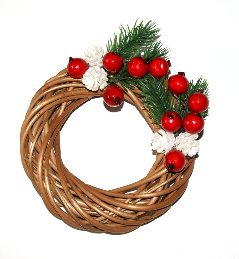 Wykonany ręcznie, niewielki świąteczny wieniec na drzwi z wikliny i ozdób w rustykalnym, minimalistycznym stylu.