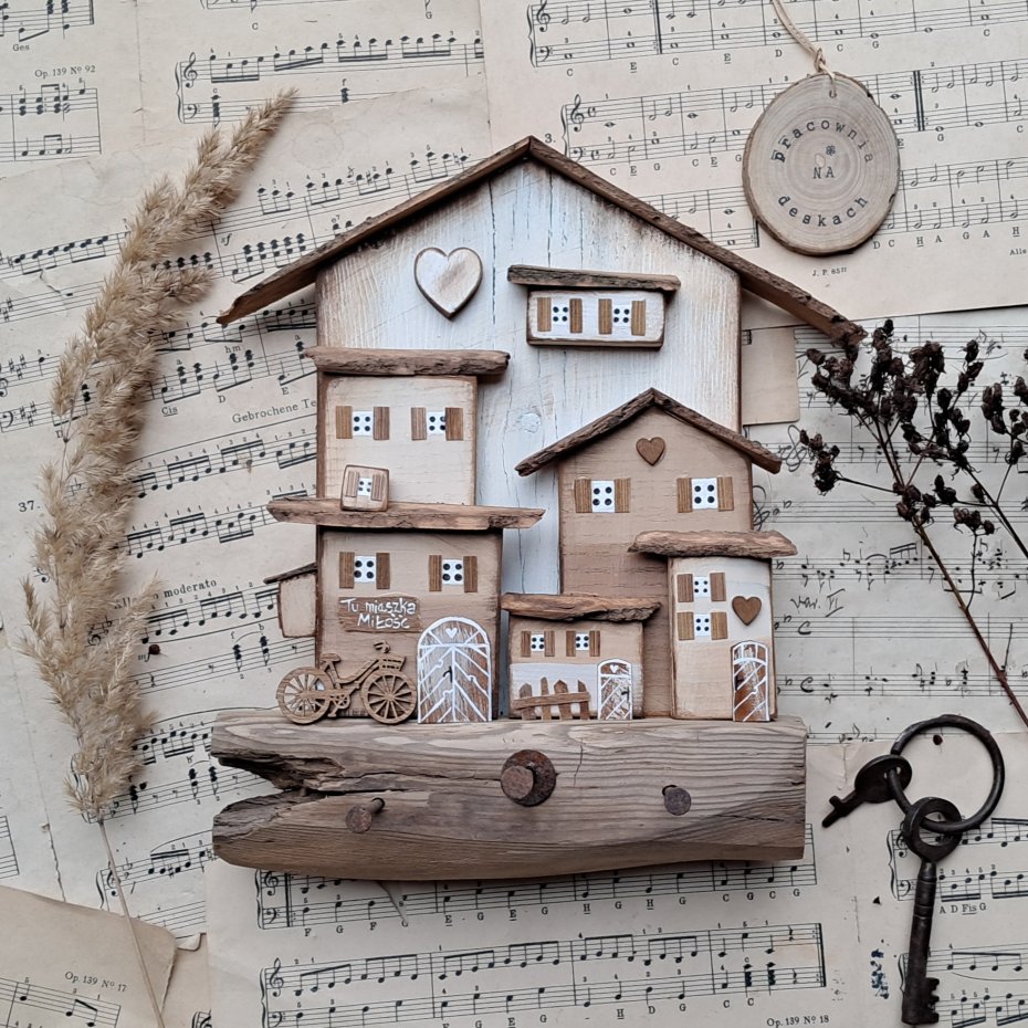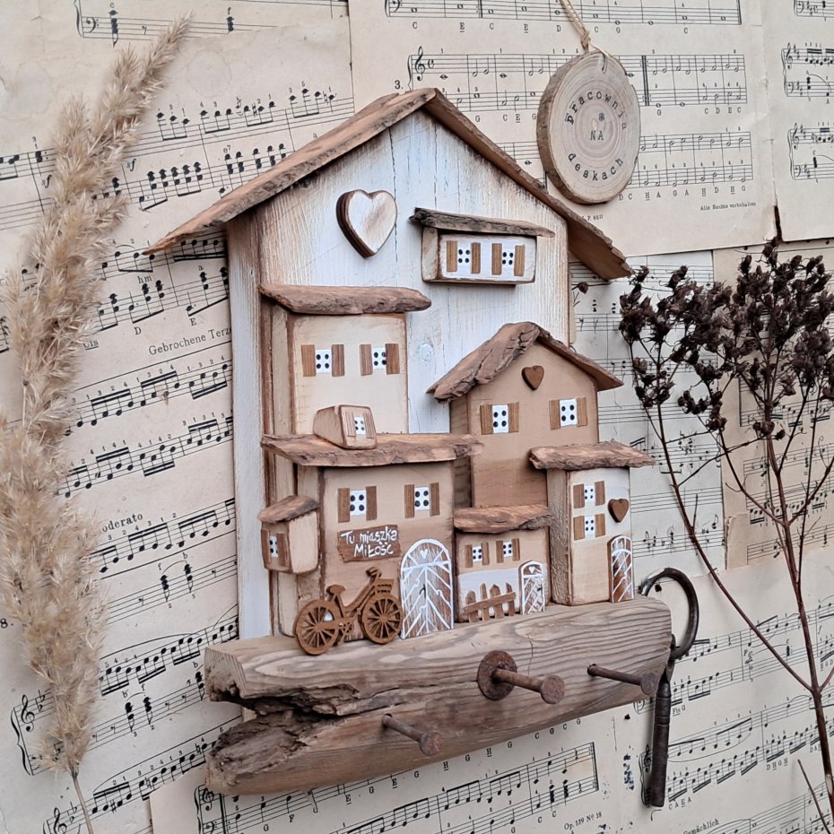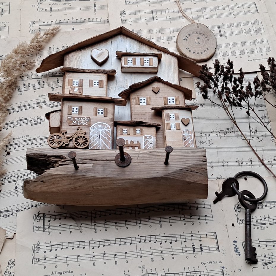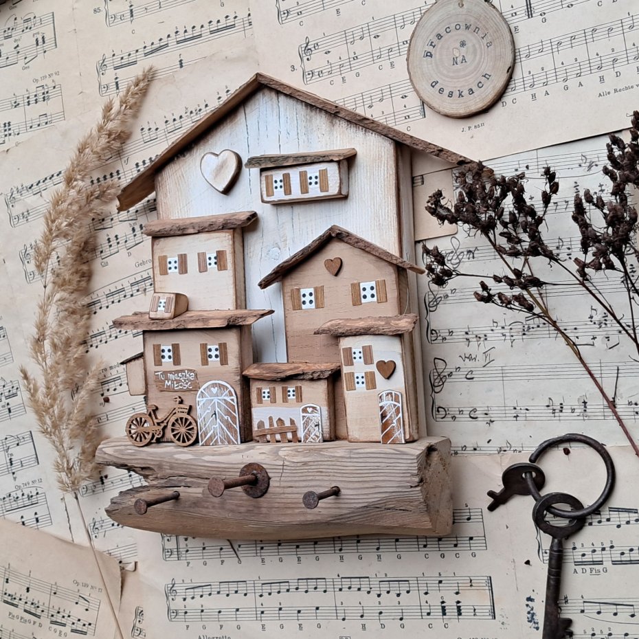 Dla wszystkich wielbicieli drewna i naturalnych dekoracji proponuję rustykany trójwymiarowy wieszak z domkami.