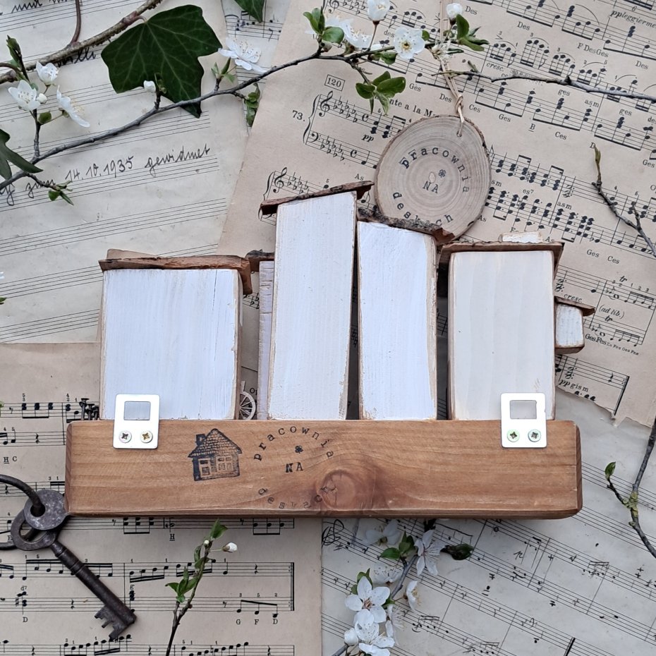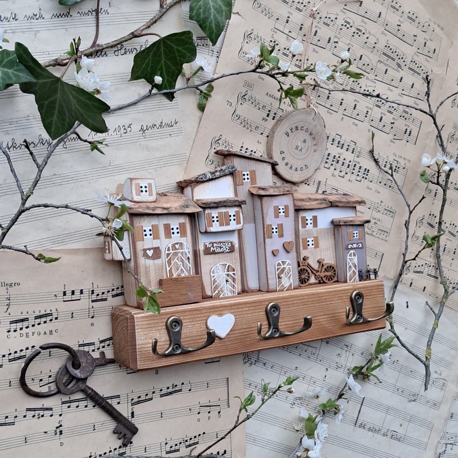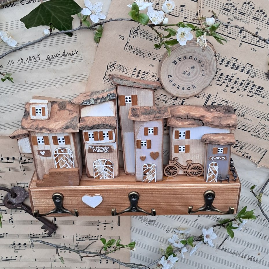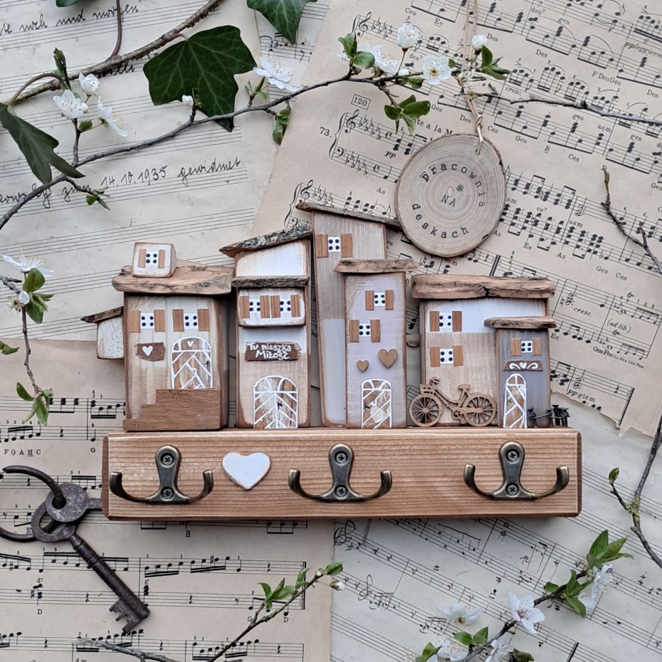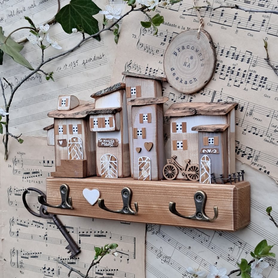 Dla wszystkich wielbicieli drewna i naturalnych dekoracji proponuję rustykany trójwymiarowy wieszak z domkami.