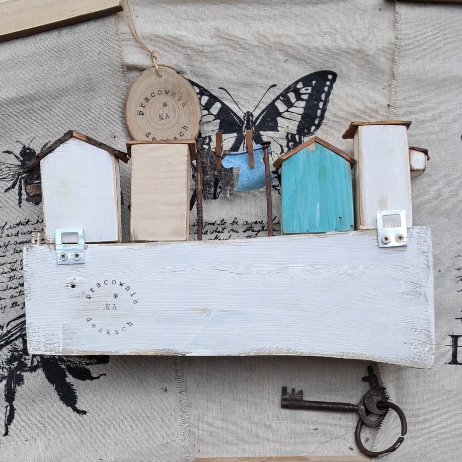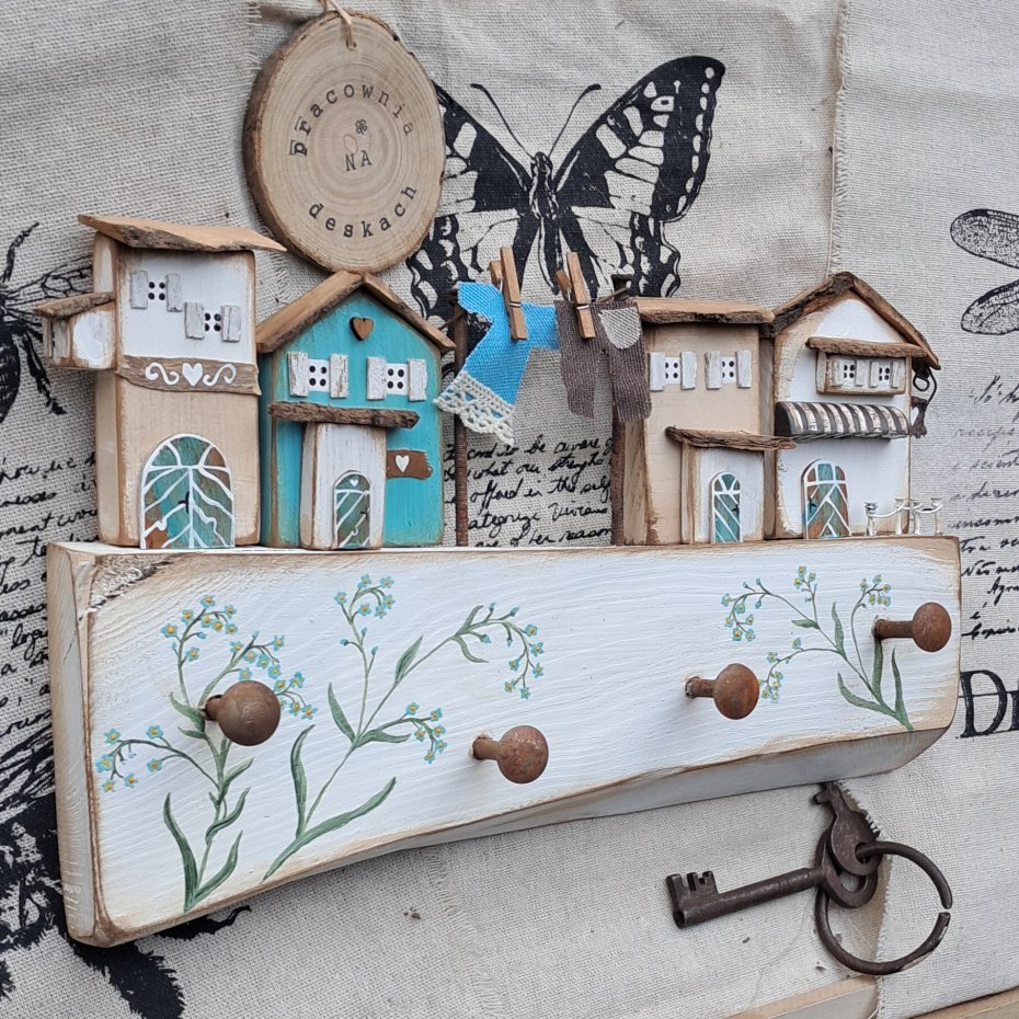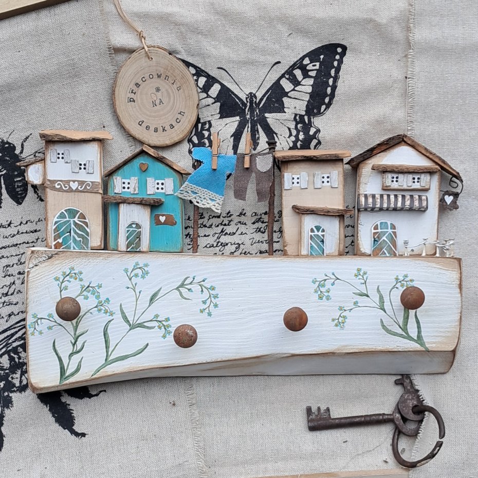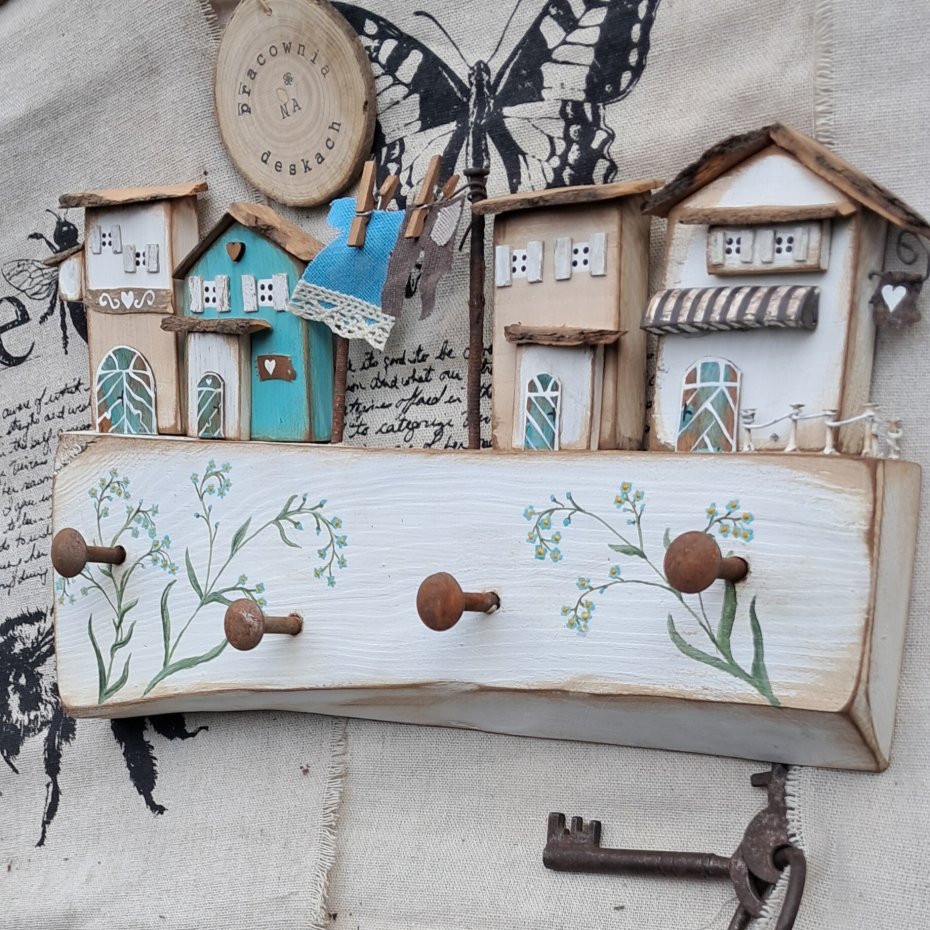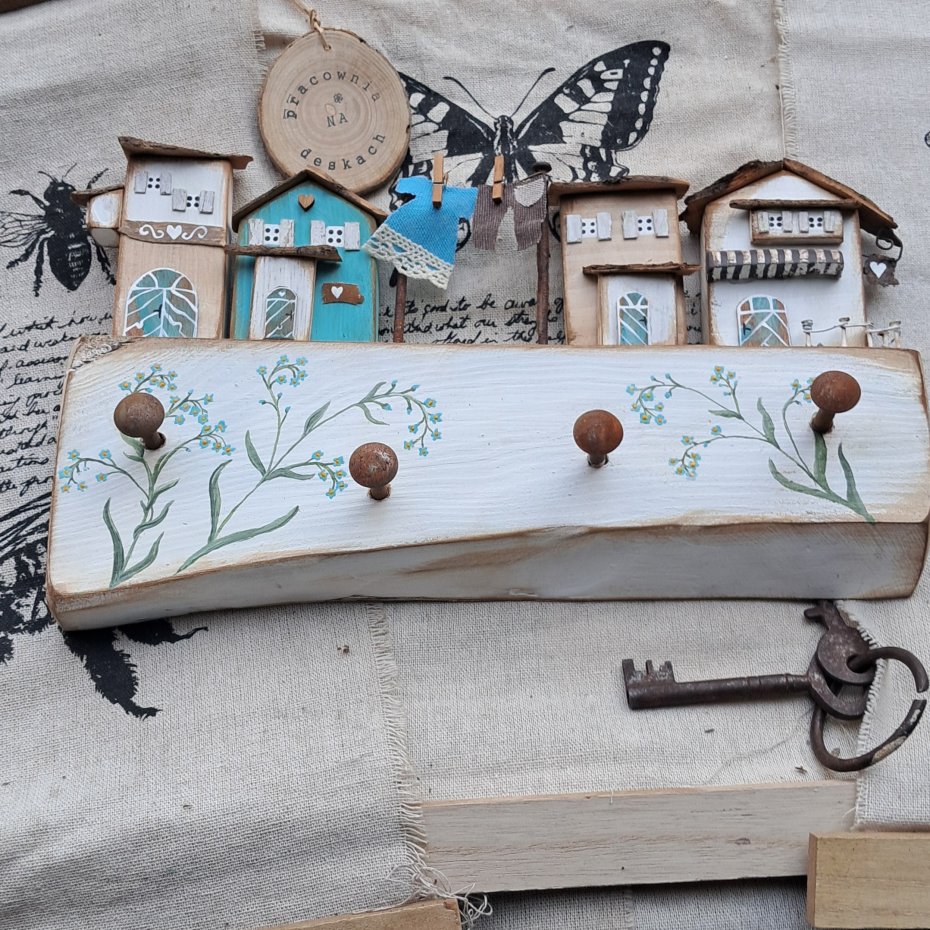 Wieszak w stylu rustykalnym z malowanymi recznie niezapominajkami,domkami i praniem. Każdy domek inny... ręcznie malowany, przecierany i przytwierdzony do listwy ze śrubami które pełnią funkcję haczyków. Wieszak ten może stanowić niebanalny oryginalny akcent w domu, ucieszy każdego wielbiciela rustykalnego stylu, idealny na prezent.