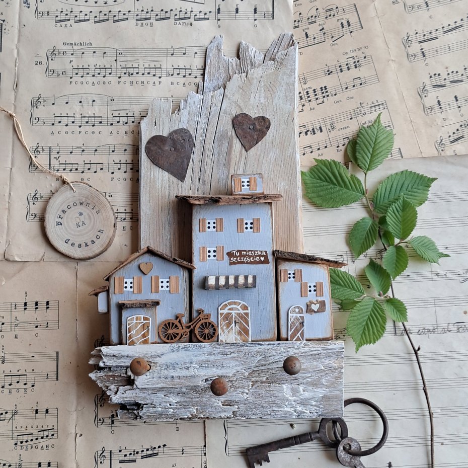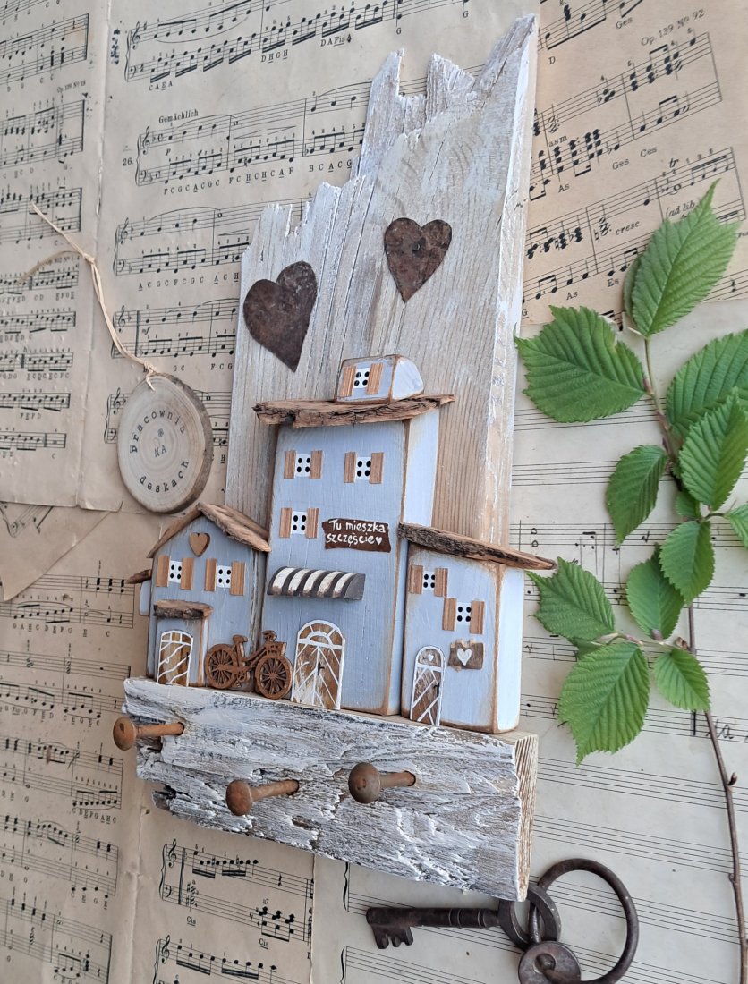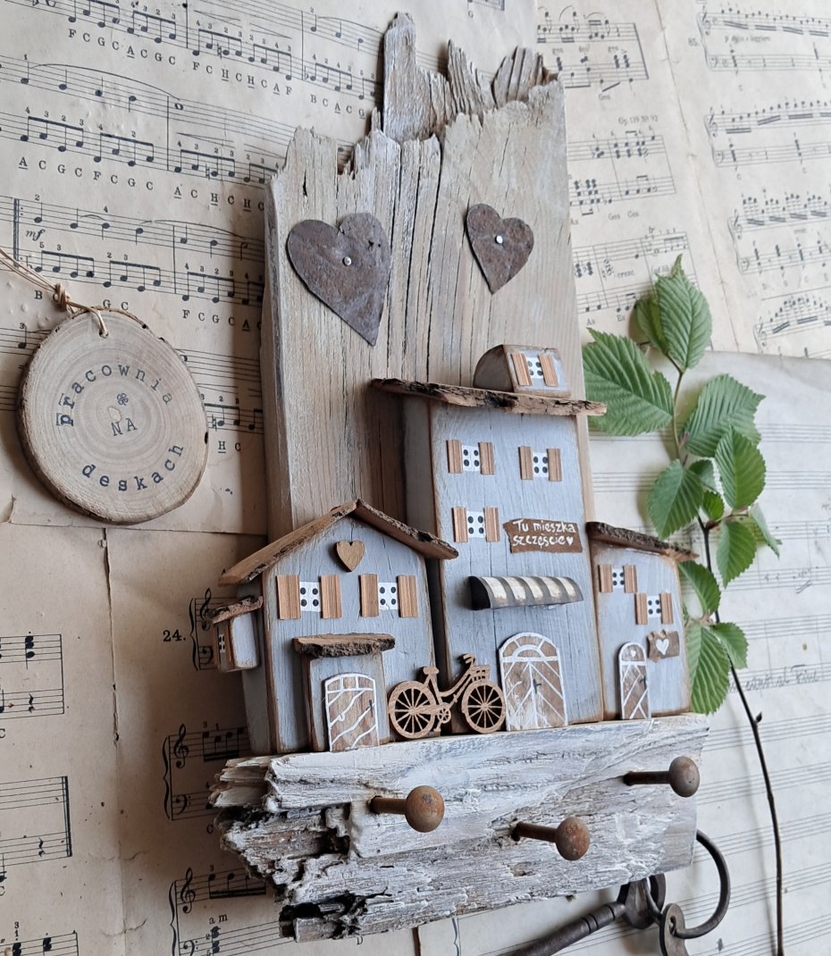 Dla wszystkich wielbicieli drewna i naturalnych dekoracji proponuję rustykany trójwymiarowy wieszak z domkami.