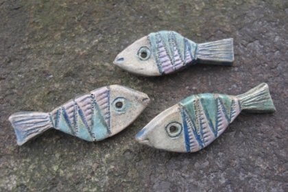 Trzy ręcznie formowane broszki ceramiczne, z jasnej kremowej gliny. Wzór ryty. Na satynowo-matowo szkliwione. Beż, szafir i pudrowy róż. Długość 6-6,5; szerokość ok. 2 cm. Do osobistych kompozycji. Autorskie. Unikatowe.