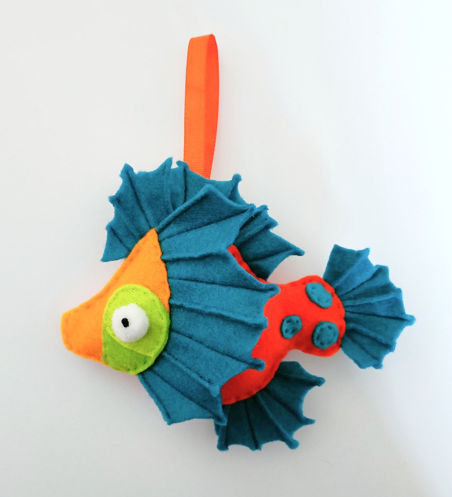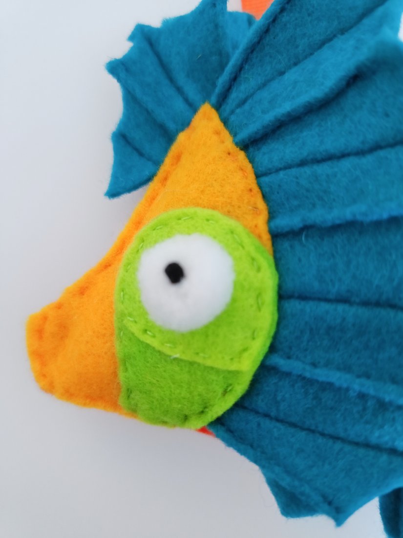Kolorowa rybka uszyta z filcu o długości 17 cm. Posiada zawieszkę z tasiemki o długości 8 cm. Uszyta ręcznie oraz ozdabiana jednostronnie.