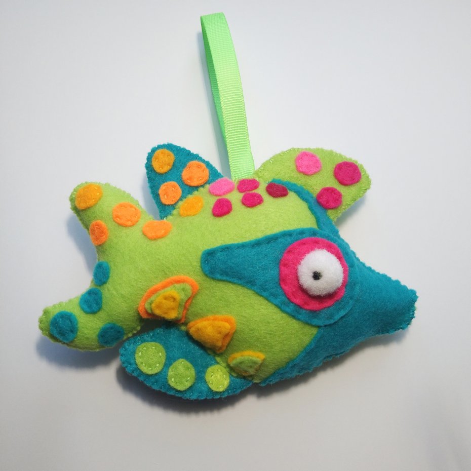 Kolorowa rybka uszyta z filcu o długości 14,5 cm. Posiada zawieszkę z tasiemki o długości 8,5 cm. Uszyta ręcznie oraz ozdabiana jednostronnie.
