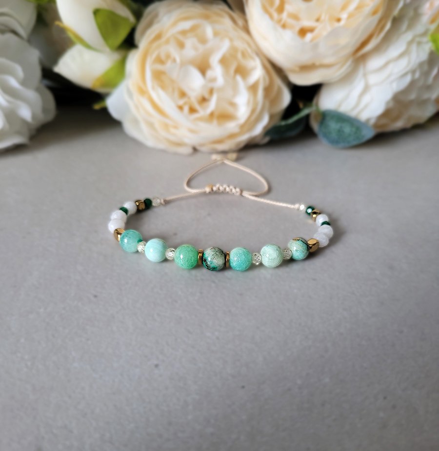 Bransoletka zrobiona z kamieni naturalnych: Angelitu, Kamienia księżycowego, Hematytu, Jadeitu oraz Cyrkonii głównie przeznaczona dla zodiakalnych Ryb.
