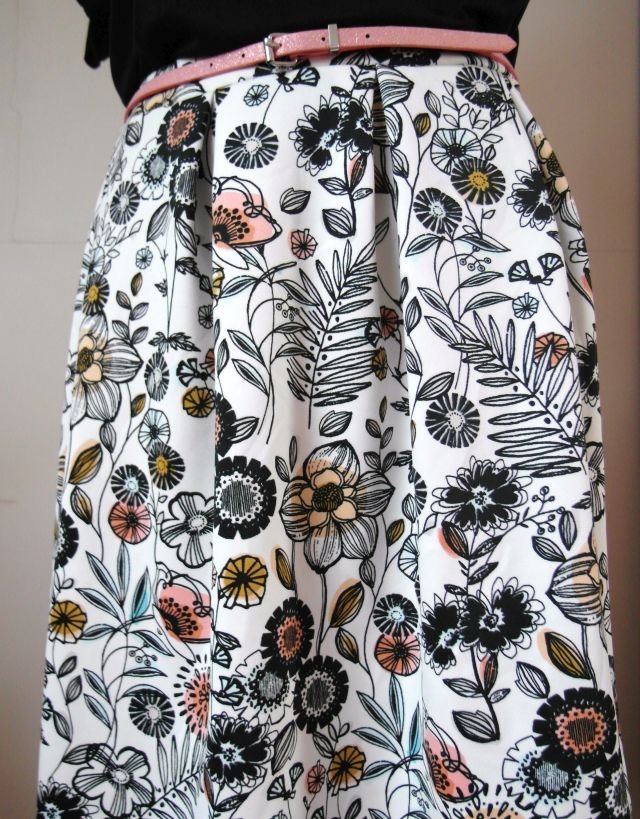W pasie gumka,szczypanki z przodu i z tyłu. Fajny materiał, lekko gumowaty. Trzyma fason, nie gniecie się.Myślę,że latem chłodzi :-)