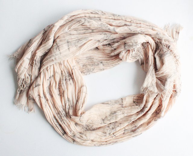 Duży, miękki szal w ciekawe szare wzory na jasnym, pudrowym tle. Materiał jest karbowany, gnieciony. Szal wykonany z bawełny.