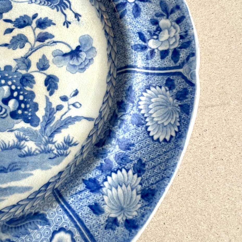 Rzadka patera! ❀ڿڰۣ❀ SPODE ANTIQUE BLUE ROOM ❀ڿڰۣ❀ Tajemniczy ogród, dawnej daty antyczna porcelanowa duża i ozdobna patera. Piękne i wyjątkowe zdobienie z tajemniczego ogrodu, a w nim nieistniejące gatunki roślin i owadów. Zdobienia odciskane z ręcznie wykonanej miedzianej płyty i ręczne zdobienie i kolorowanie.