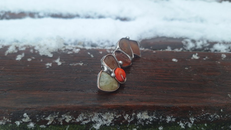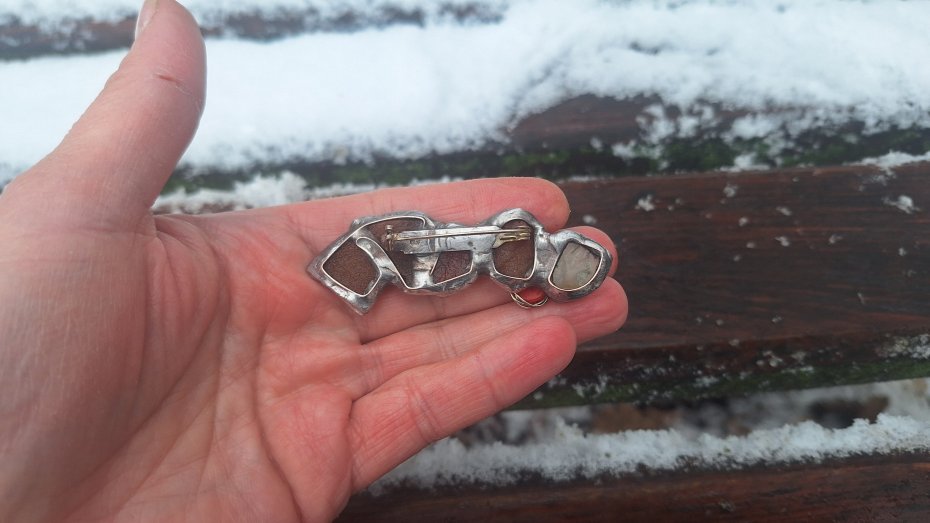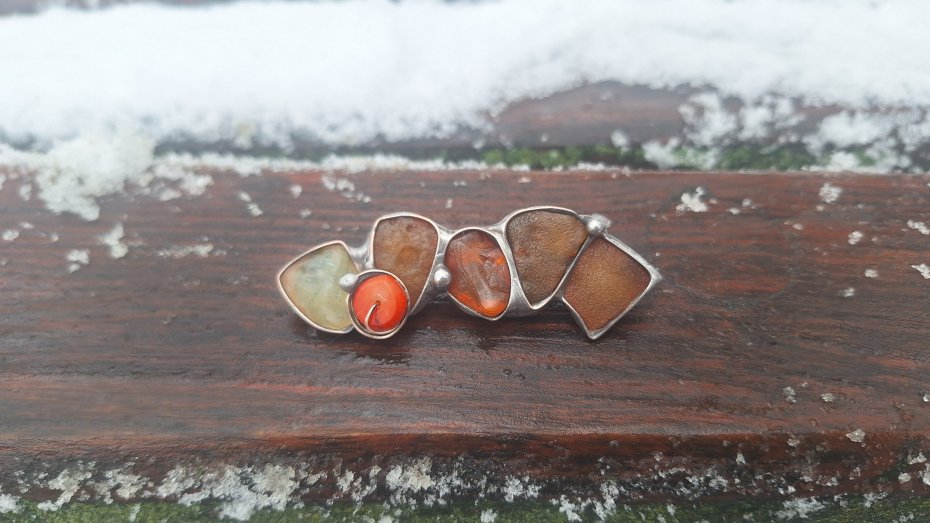 Broszka wykonana z miedzi, cyny, prenitu, koralowca i bursztynów. Wymiary ok. 7 na 2 m. Zapięcie metalowe.