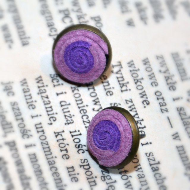 Delikatne sztyfty wykonane zostały z rzemyka oraz metalowych elementów w kolorze antycznego brązu. Średnica ok 1,4 cm. Zapakowane w pięknym papierowym pudełeczku.
