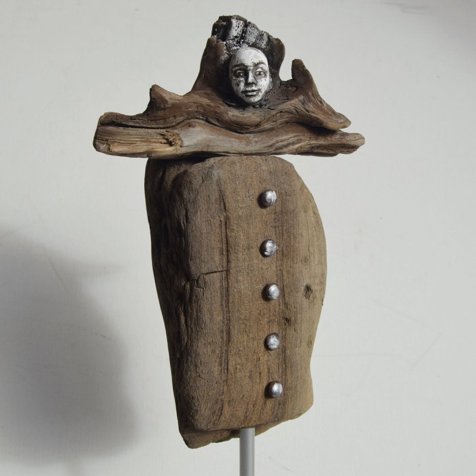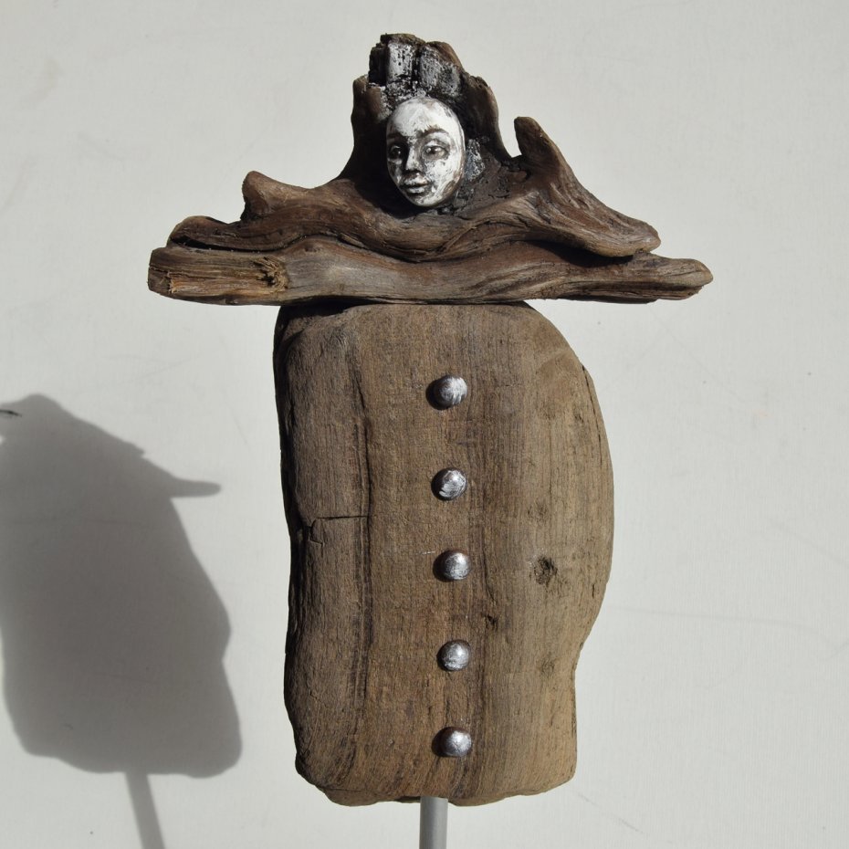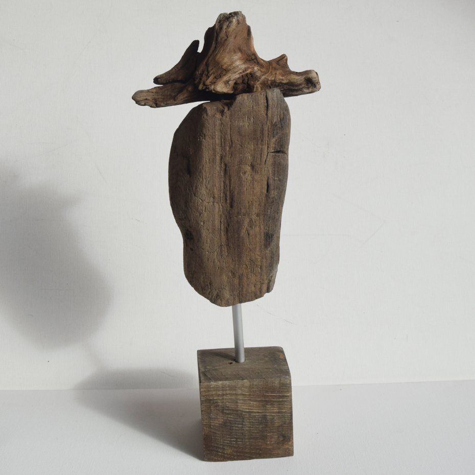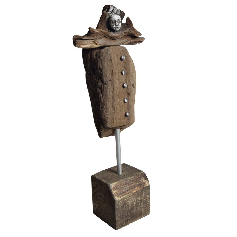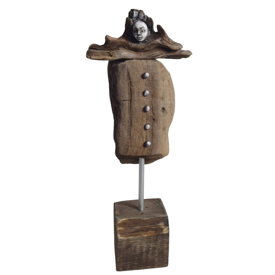 Rzeźba/ figurka - abstrakcyjna postać, dekoracja wykonana ze znalezionego na bałtyckiej plaży starego drewna, oraz gipsu, z podstawą z drewna ze starych palet. Niepowtarzalny kształt wyrzeźbionego przez wodę i czas drewna sprawia, że rzeźba jest unikatowa - jedyny, niepowtarzalny egzemplarz. Wykorzystaniem starego drewna z palet, z jego niedoskonałościami, otworami po gwoździach, dekoracja nawiązuje do stylu wabi-sabi.