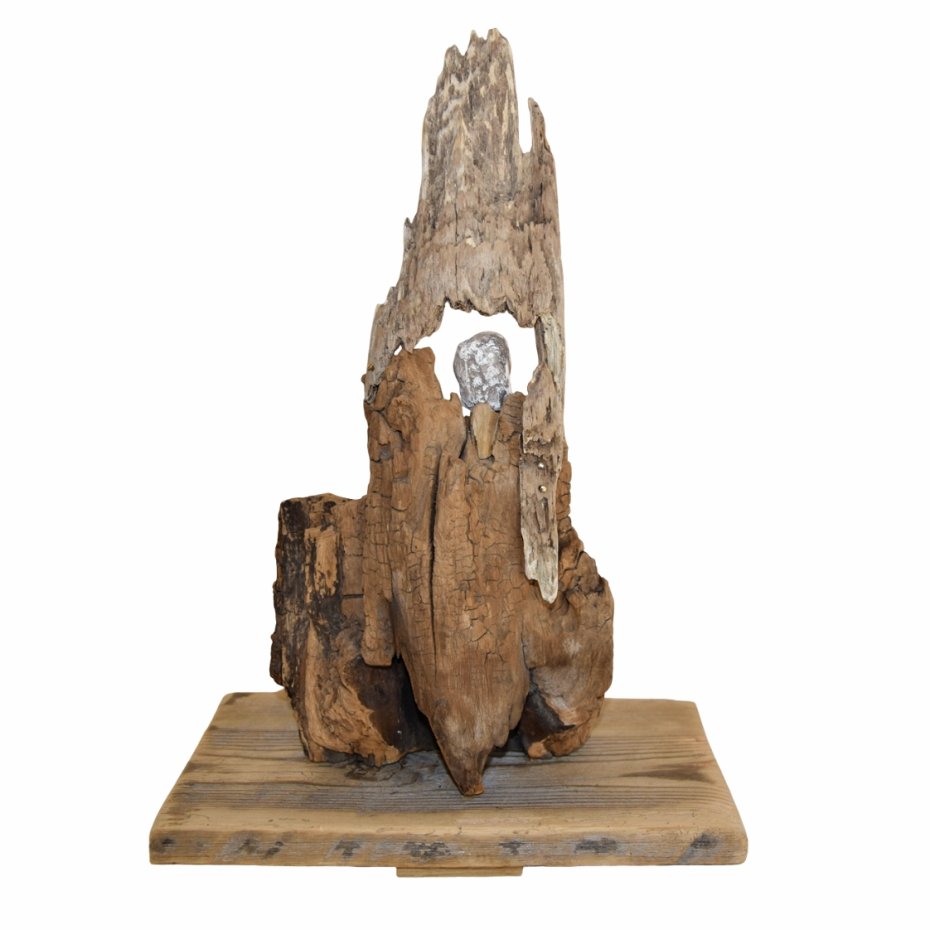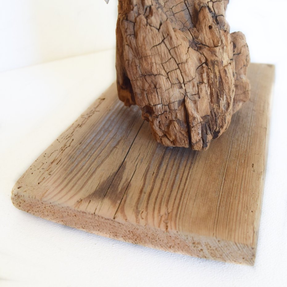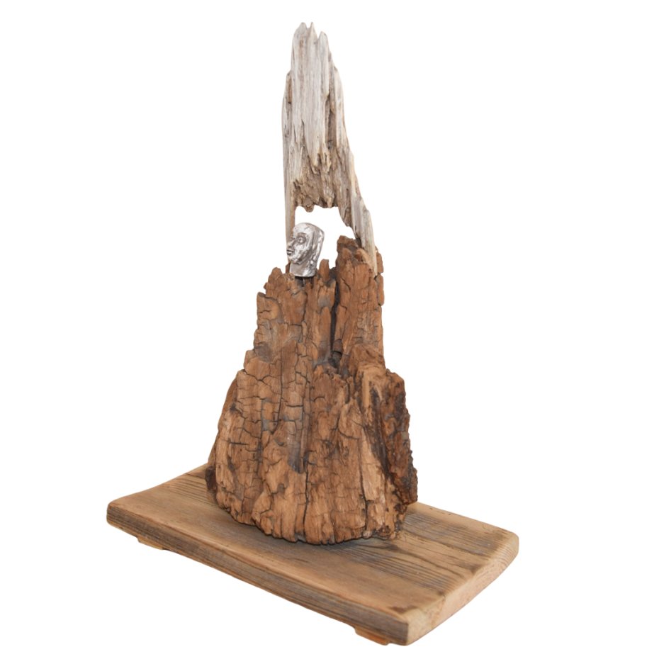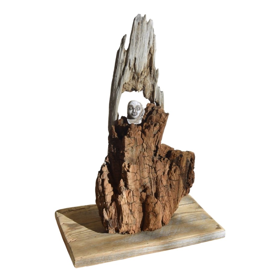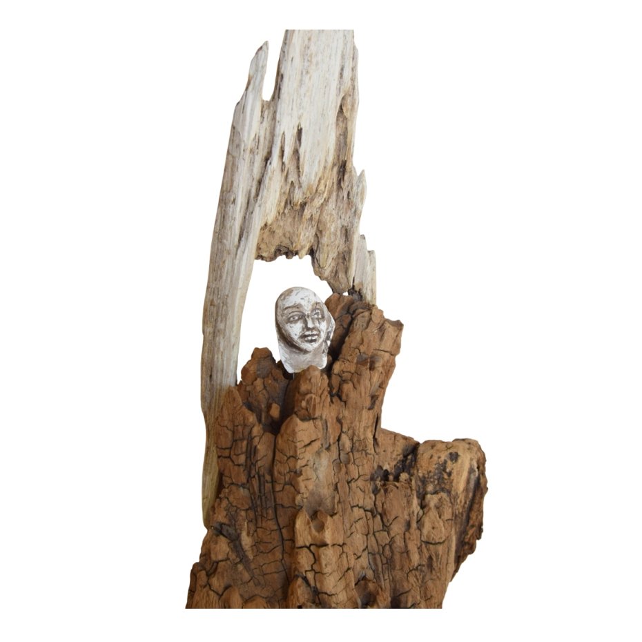 Rzeźba/ figurka - abstrakcyjna postać, dekoracja wykonana ze znalezionego na bałtyckiej plaży starego drewna, oraz gipsu, z podstawą z drewna ze starej deski. Niepowtarzalny kształt wyrzeźbionego przez wodę i czas drewna sprawia, że rzeźba jest unikatowa - jedyny, niepowtarzalny egzemplarz. Wykorzystaniem starego drewna z jego niedoskonałościami dekoracja nawiązuje do stylu wabi-sabi.