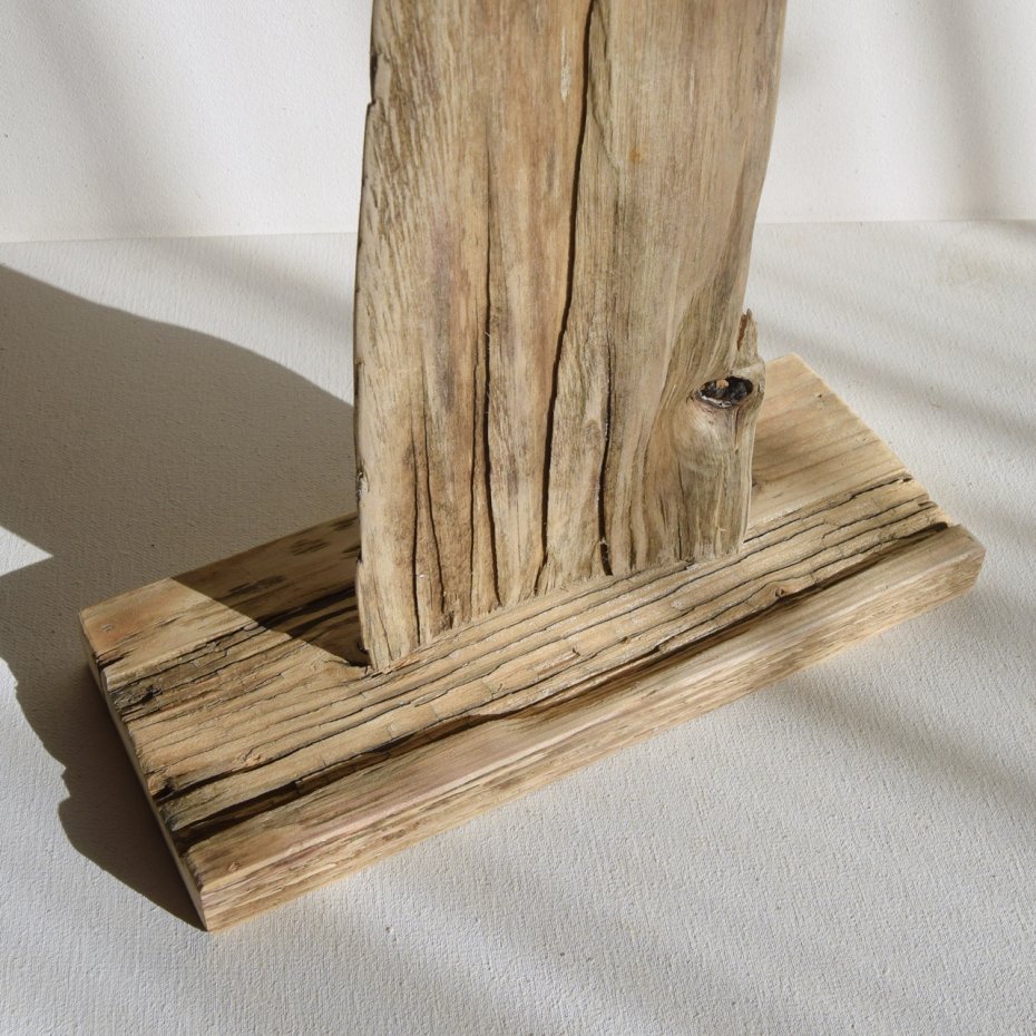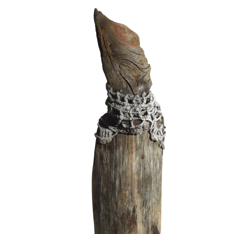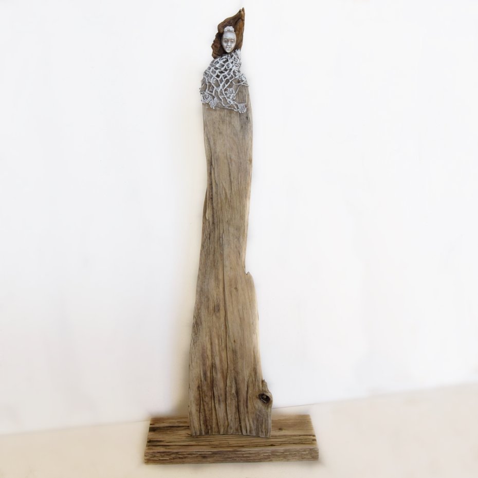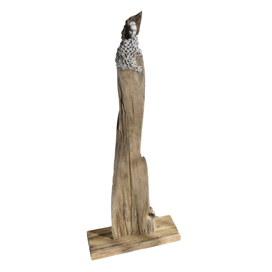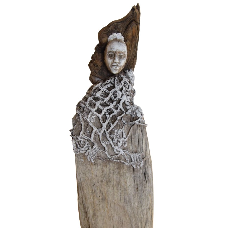Rzeźba/ figurka - abstrakcyjna postać, dekoracja wykonana ze znalezionego na bałtyckiej plaży starego drewna, oraz gipsu i starego szydełkowego obrusu, z podstawą z drewna ze starej deski. Niepowtarzalny kształt wyrzeźbionego przez wodę i czas drewna sprawia, że rzeźba jest unikatowa - jedyny, niepowtarzalny egzemplarz. Wykorzystaniem starego drewna z jego niedoskonałościami dekoracja nawiązuje do stylu wabi-sabi.